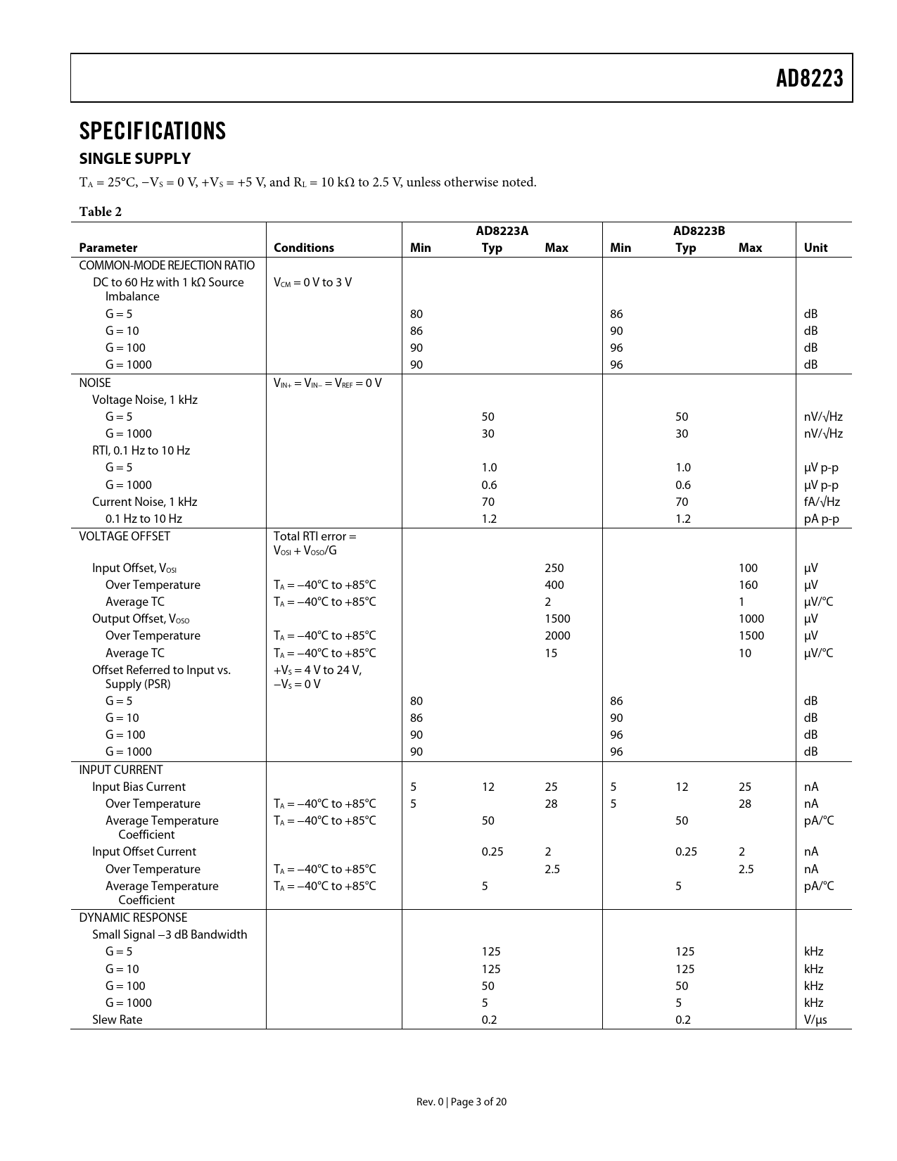 AD8223 SPECIFICATIONS SINGLE SUPPLY Table 2 AD8223A AD8223B Parameter Conditions Min Typ Max Unit