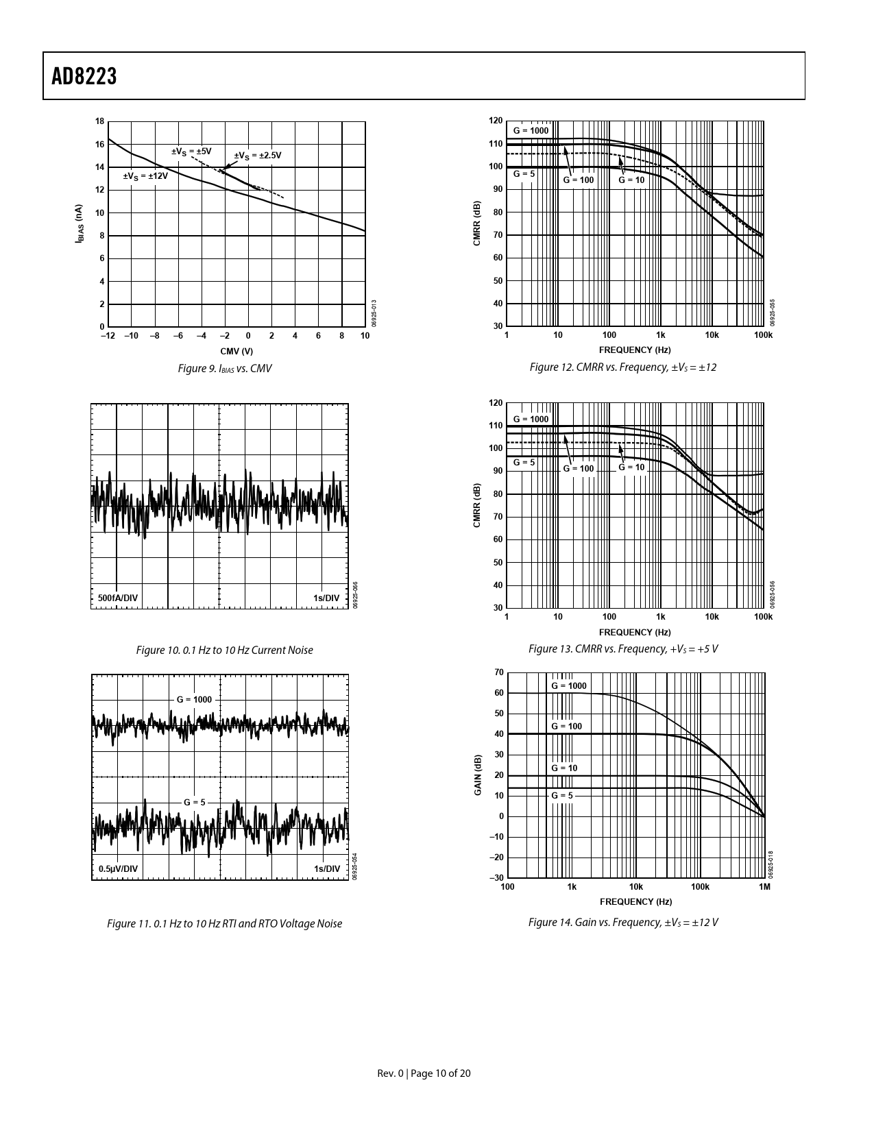 AD8223. 120. G = 1000. 110. ±VS = ±5V. ±VS = ±2.5V. 100. G = 5. S = ±12V. G = 100. G = 10. ) A. (n S. R (. I BI. –12 –10. 10k. 100k. CMV (V). FREQUENCY (Hz)