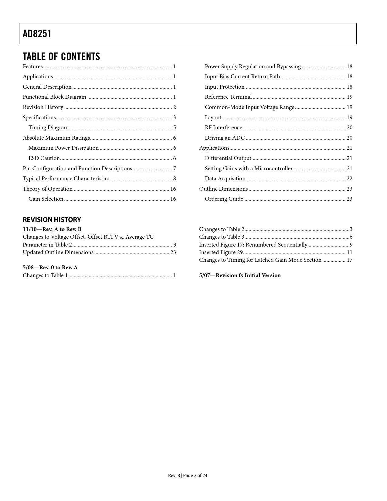 link to page 1 link to page 1 link to page 1 link to page 1 link to page 1 link to page 1 link to page 1 link to page 1 link to page 2 link to page 2 link to page 3 link to page 3 link to page 5 link to page 5 link to page 6 link to page 6 link to page 6 link to page 6 link to page 6 link to page 6 link to page 7 link to page 7 link to page 8 link to page 8 link to page 16 link to page 16 link to page 16 link to page 16 link to page 18 link to page 18 link to page 18 link to page 18 link to page 18 link to page 18 link to page 19 link to page 19 link to page 19 link to page 19 link to page 19 link to page 19 link to page 20 link to page 20 link to page 20 link to page 20 link to page 21 link to page 21 link to page 21 link to page 21 link to page 21 link to page 21 link to page 22 link to page 22 link to page 23 link to page 23 link to page 23 link to page 23 AD8251TABLE OF CONTENTS Features .. 1 Power Supply Regulation and Bypassing .. 18 Applications... 1 Input Bias Current Return Path ... 18 General Description ... 1 Input Protection ... 18 Functional Block Diagram .. 1 Reference Terminal .. 19 Revision History ... 2 Common-Mode Input Voltage Range ... 19 Specifications... 3 Layout .. 19 Timing Diagram ... 5 RF Interference ... 20 Absolute Maximum Ratings.. 6 Driving an ADC ... 20 Maximum Power Dissipation ... 6 Applications... 21 ESD Caution.. 6 Differential Output .. 21 Pin Configuration and Function Descriptions... 7 Setting Gains with a Microcontroller .. 21 Typical Performance Characteristics ... 8 Data Acquisition... 22 Theory of Operation .. 16 Outline Dimensions ... 23 Gain Selection ... 16 Ordering Guide .. 23 REVISION HISTORY11/10—Rev. A to Rev. B Changes to Table 2...3 Changes to Voltage Offset, Offset RTI VOS, Average TC Changes to Table 3...6 Parameter in Table 2... 3 Inserted Figure 17; Renumbered Sequentially ..9 Updated Outline Dimensions ... 23 Inserted Figure 29... 11 Changes to Timing for Latched Gain Mode Section ... 17 5/08—Rev. 0 to Rev. A Changes to Table 1.. 1 5/07—Revision 0: Initial Version Rev. B | Page 2 of 24 Document Outline FEATURES APPLICATIONS GENERAL DESCRIPTION FUNCTIONAL BLOCK DIAGRAM TABLE OF CONTENTS REVISION HISTORY SPECIFICATIONS TIMING DIAGRAM ABSOLUTE MAXIMUM RATINGS MAXIMUM POWER DISSIPATION ESD CAUTION PIN CONFIGURATION AND FUNCTION DESCRIPTIONS TYPICAL PERFORMANCE CHARACTERISTICS THEORY OF OPERATION GAIN SELECTION Transparent Gain Mode Latched Gain Mode Timing for Latched Gain Mode POWER SUPPLY REGULATION AND BYPASSING INPUT BIAS CURRENT RETURN PATH INPUT PROTECTION REFERENCE TERMINAL COMMON-MODE INPUT VOLTAGE RANGE LAYOUT Grounding Coupling Noise Common-Mode Rejection RF INTERFERENCE DRIVING AN ADC APPLICATIONS DIFFERENTIAL OUTPUT SETTING GAINS WITH A MICROCONTROLLER DATA ACQUISITION OUTLINE DIMENSIONS ORDERING GUIDE