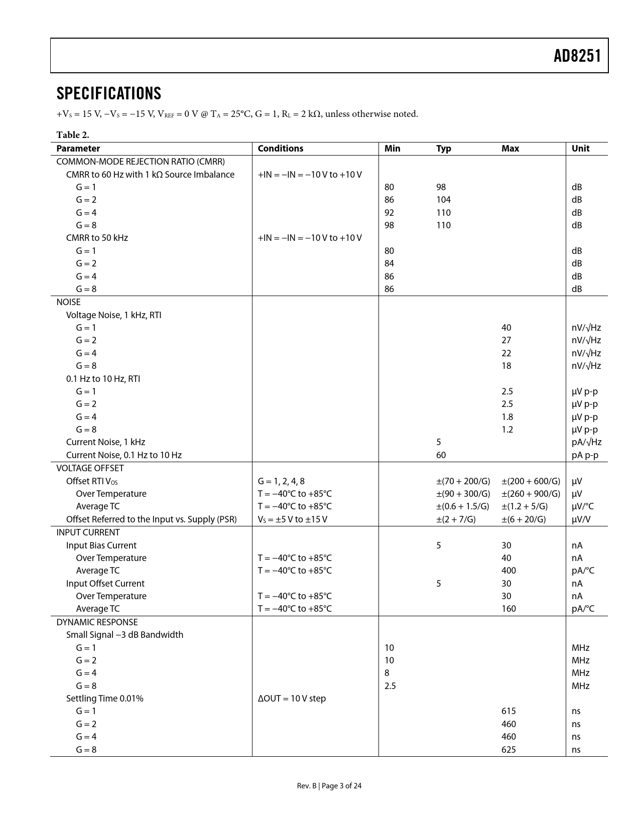 AD8251 SPECIFICATIONS Table 2 Parameter Conditions Min Typ Max Unit