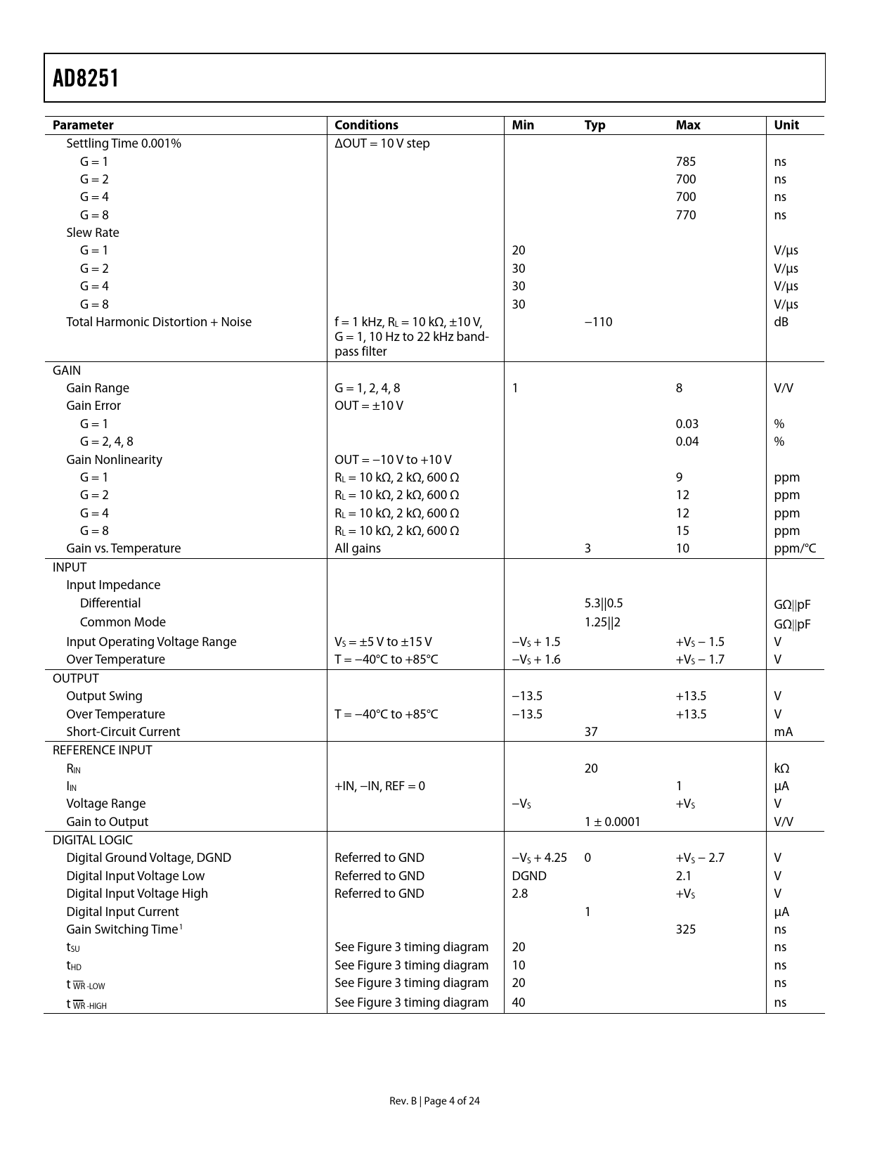 Seiten / Seite24 / 4 — AD8251. Parameter. Conditions. Min. Typ. Max. Unit