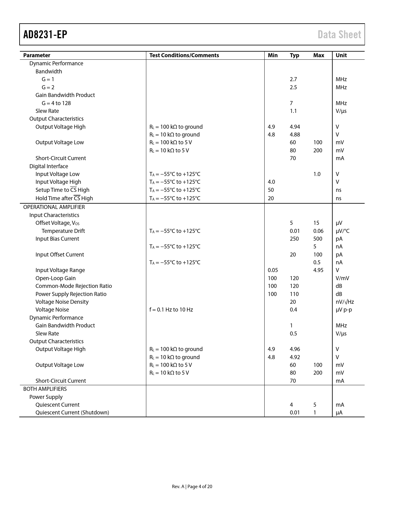 AD8231-EPData SheetParameterTest Conditions/CommentsMinTypMaxUnit Dynamic Performance Bandwidth G = 1 2.7 MHz G = 2 2.5 MHz Gain Bandwidth Product G = 4 to 128 7 MHz Slew Rate 1.1 V/µs Output Characteristics Output Voltage High RL = 100 kΩ to ground 4.9 4.94 V RL = 10 kΩ to ground 4.8 4.88 V Output Voltage Low RL = 100 kΩ to 5 V 60 100 mV RL = 10 kΩ to 5 V 80 200 mV Short-Circuit Current 70 mA Digital Interface Input Voltage Low TA = −55°C to +125°C 1.0 V Input Voltage High TA = −55°C to +125°C 4.0 V Setup Time to CS High TA = −55°C to +125°C 50 ns Hold Time after CS High TA = −55°C to +125°C 20 ns OPERATIONAL AMPLIFIER Input Characteristics Offset Voltage, VOS 5 15 µV Temperature Drift TA = −55°C to +125°C 0.01 0.06 µV/°C Input Bias Current 250 500 pA TA = −55°C to +125°C 5 nA Input Offset Current 20 100 pA TA = −55°C to +125°C 0.5 nA Input Voltage Range 0.05 4.95 V Open-Loop Gain 100 120 V/mV Common-Mode Rejection Ratio 100 120 dB Power Supply Rejection Ratio 100 110 dB Voltage Noise Density 20 nV/√Hz Voltage Noise f = 0.1 Hz to 10 Hz 0.4 µV p-p Dynamic Performance Gain Bandwidth Product 1 MHz Slew Rate 0.5 V/µs Output Characteristics Output Voltage High RL = 100 kΩ to ground 4.9 4.96 V RL = 10 kΩ to ground 4.8 4.92 V Output Voltage Low RL = 100 kΩ to 5 V 60 100 mV RL = 10 kΩ to 5 V 80 200 mV Short-Circuit Current 70 mA BOTH AMPLIFIERS Power Supply Quiescent Current 4 5 mA Quiescent Current (Shutdown) 0.01 1 µA Rev. A | Page 4 of 20 Document Outline FEATURES ENHANCED PRODUCT FEATURES FUNCTIONAL BLOCK DIAGRAM GENERAL DESCRIPTION REVISION HISTORY SPECIFICATIONS ABSOLUTE MAXIMUM RATINGS THERMAL RESISTANCE MAXIMUM POWER DISSIPATION ESD CAUTION PIN CONFIGURATION AND FUNCTION DESCRIPTIONS TYPICAL PERFORMANCE CHARACTERISTICS INSTRUMENTATION AMPLIFIER PERFORMANCE CURVES OPERATIONAL AMPLIFIER PERFORMANCE CURVES PERFORMANCE CURVES VALID FOR BOTH AMPLIFIERS OUTLINE DIMENSIONS ORDERING GUIDE