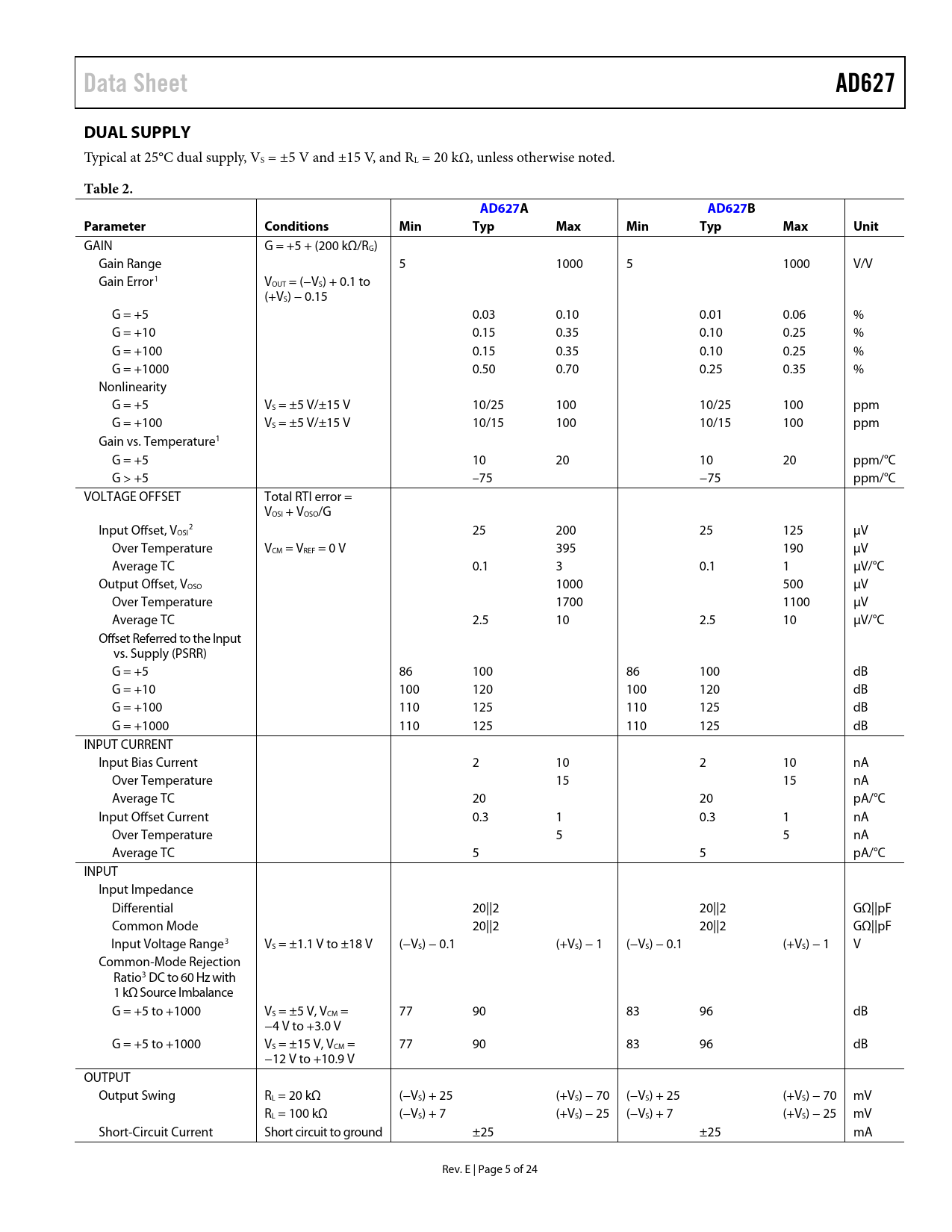 Data Sheet. AD627. DUAL SUPPLY. Table 2. AD627A. AD627B. Parameter. Conditions. Min. Typ. Max. Unit