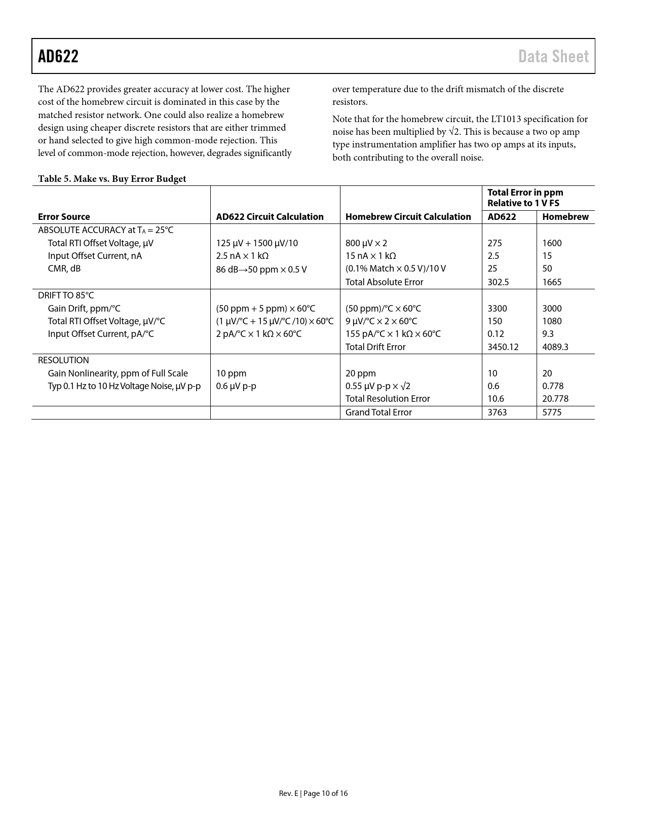 AD622. Data Sheet. Table 5. Make vs. Buy Error Budget. Total Error in ppm Relative to 1 V FS. Error Source