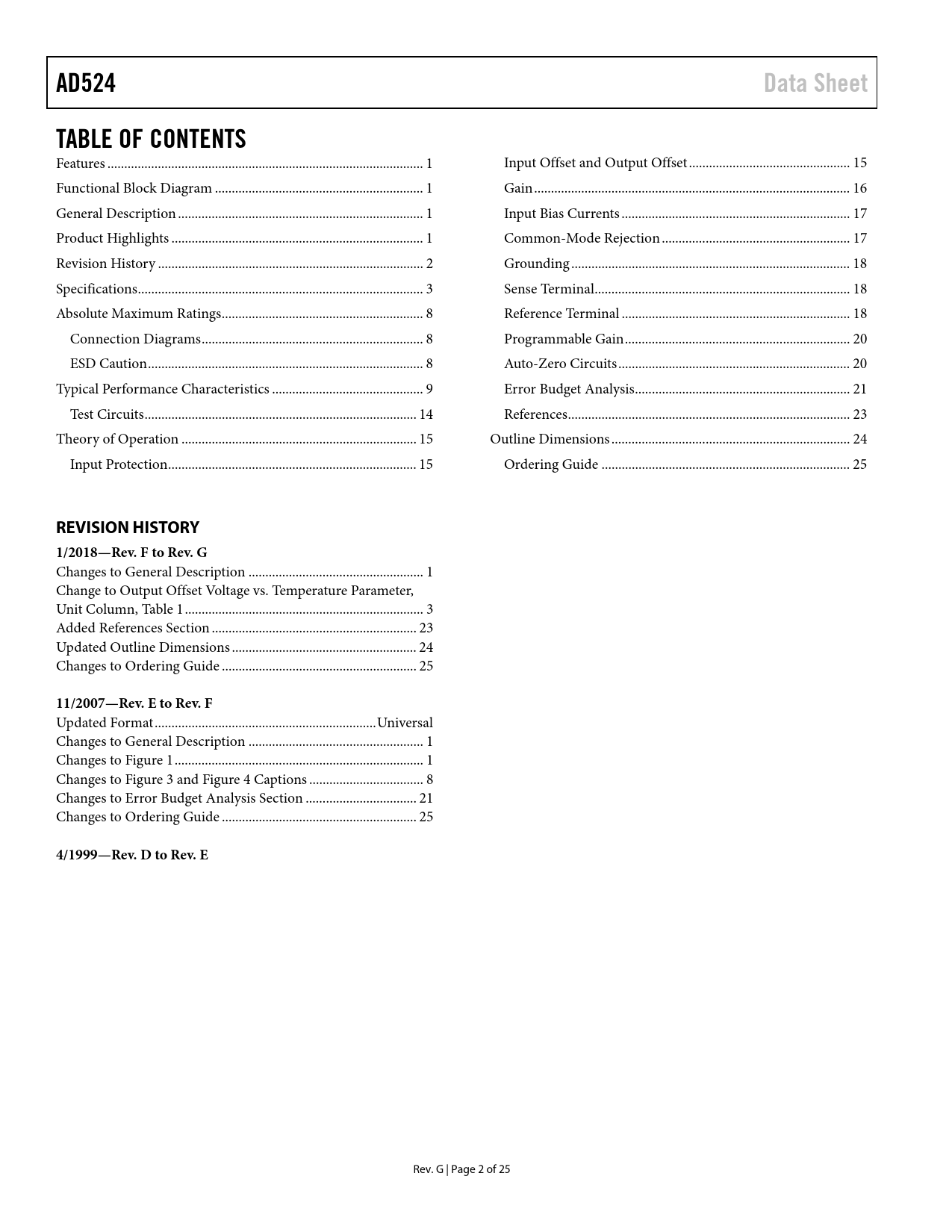 Seiten / Seite25 / 2 — AD524. Data Sheet. TABLE OF CONTENTS. REVISION HISTORY. 1/2018—Rev. F to …