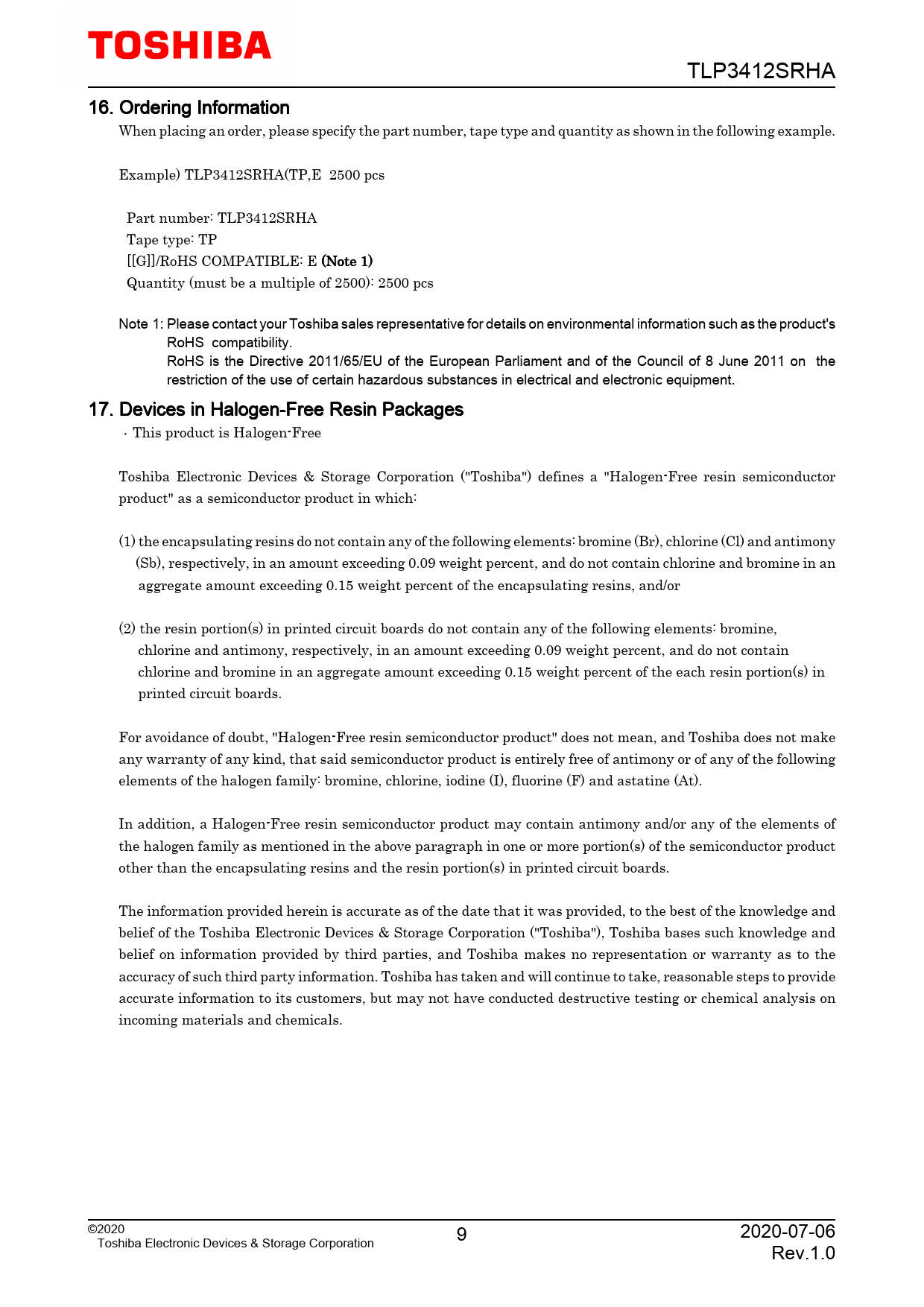 TLP3412SRHA 16. Ordering Information When placing an order, please specify the part number, tape type and quantity as shown in the following example. Example) TLP3412SRHA(TP,E 2500 pcs Part number: TLP3412SRHA Tape type: TP [[G]]/RoHS COMPATIBLE: E (Note 1) Quantity (must be a multiple of 2500): 2500 pcs Note 1: Please contact your Toshiba sales representative for details on environmental information such as the product's RoHS compatibility. RoHS is the Directive 2011/65/EU of the European Parliament and of the Council of 8 June 2011 on the restriction of the use of certain hazardous substances in electrical and electronic equipment. 17. Devices in Halogen-Free Resin Packages This product is Halogen-Free Toshiba Electronic Devices & Storage Corporation ("Toshiba") defines a "Halogen-Free resin semiconductor product" as a semiconductor product in which: (1) the encapsulating resins do not contain any of the following elements: bromine (Br), chlorine (Cl) and antimony (Sb), respectively, in an amount exceeding 0.09 weight percent, and do not contain chlorine and bromine in an aggregate amount exceeding 0.15 weight percent of the encapsulating resins, and/or (2) the resin portion(s) in printed circuit boards do not contain any of the following elements: bromine, chlorine and antimony, respectively, in an amount exceeding 0.09 weight percent, and do not contain chlorine and bromine in an aggregate amount exceeding 0.15 weight percent of the each resin portion(s) in printed circuit boards. For avoidance of doubt, "Halogen-Free resin semiconductor product" does not mean, and Toshiba does not make any warranty of any kind, that said semiconductor product is entirely free of antimony or of any of the following elements of the halogen family: bromine, chlorine, iodine (I), fluorine (F) and astatine (At). In addition, a Halogen-Free resin semiconductor product may contain antimony and/or any of the elements of the halogen family as mentioned in the above paragraph in one or more portion(s) of the semiconductor product other than the encapsulating resins and the resin portion(s) in printed circuit boards. The information provided herein is accurate as of the date that it was provided, to the best of the knowledge and belief of the Toshiba Electronic Devices & Storage Corporation ("Toshiba"), Toshiba bases such knowledge and belief on information provided by third parties, and Toshiba makes no representation or warranty as to the accuracy of such third party information. Toshiba has taken and will continue to take, reasonable steps to provide accurate information to its customers, but may not have conducted destructive testing or chemical analysis on incoming materials and chemicals. ©2020 9 2020-07-06 Toshiba Electronic Devices & Storage Corporation Rev.1.0