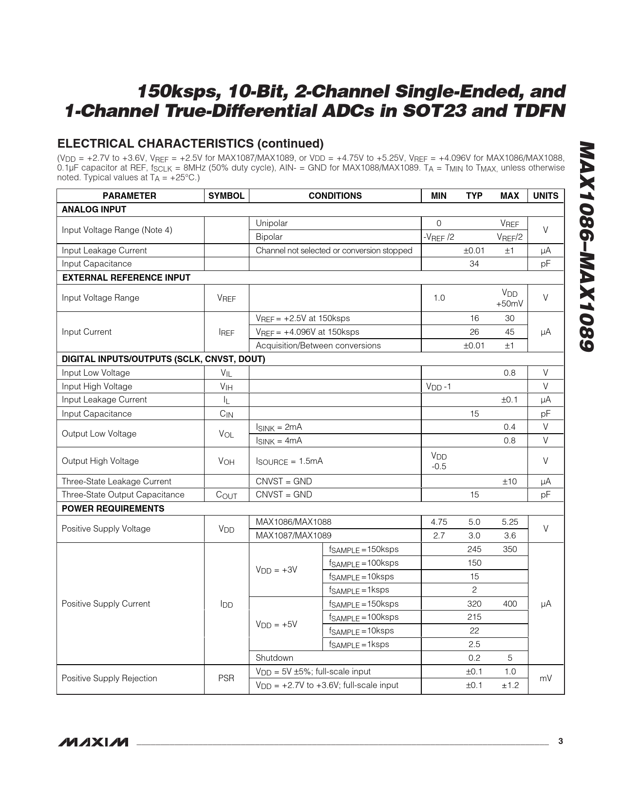 MAX1086/MAX1088 4.75 5.0 5.25 Positive Supply Voltage VDD V MAX1087/MAX1089 2.7 3.0 3.6 fSAMPLE =150ksps 245 350 fSAMPLE =100ksps 150 VDD = +3V fSAMPLE =10ksps 15 fSAMPLE =1ksps 2 Positive Supply Current IDD fSAMPLE =150ksps 320 400 µA fSAMPLE =100ksps 215 VDD = +5V fSAMPLE =10ksps 22 fSAMPLE =1ksps 2.5 Shutdown 0.2 5 VDD = 5V ±5%; full-scale input ±0.1 1.0 Positive Supply Rejection PSR mV VDD = +2.7V to +3.6V; full-scale input ±0.1 ±1.2