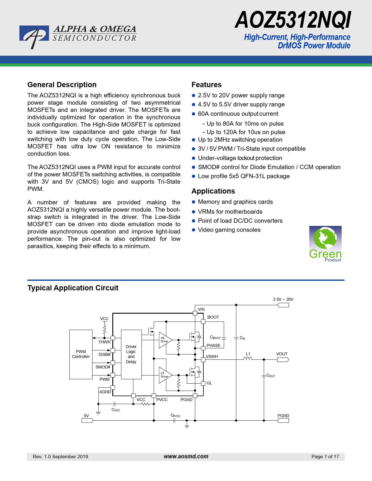 The AOZ5312NQI is a high efficiency synchronous buck 2.5V to 20V power supply range power stage module consisting of two asymmetrical 4.5V to 5.5V driver supply range MOSFETs and an integrated driver. The MOSFETs are individually optimized for operation in the synchronous 60A continuous output current buck configuration. The High-Side MOSFET is optimized - Up to 80A for 10ms on pulse to achieve low capacitance and gate charge for fast - Up to 120A for 10us on pulse switching with low duty cycle operation. The Low-Side Up to 2MHz switching operation MOSFET has ultra low ON resistance to minimize 3V / 5V PWM / Tri-State input compatible conduction loss. Under-voltage lockout protection The AOZ5312NQI uses a PWM input for accurate control SMOD# control for Diode Emulation / CCM operation of the power MOSFETs switching activities, is compatible Low profile 5x5 QFN-31L package with 3V and 5V (CMOS) logic and supports Tri-State PWM.