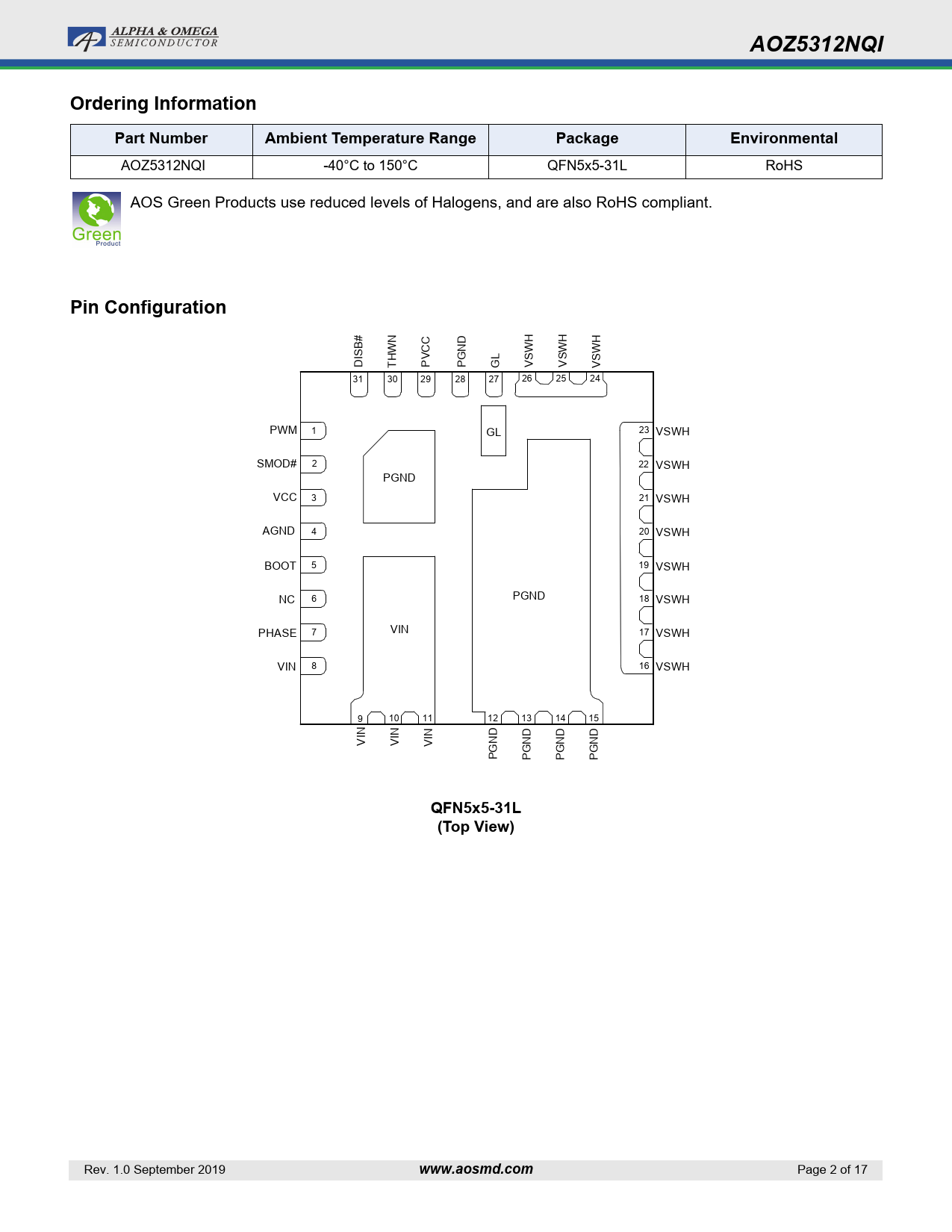 AOZ5312NQI. Ordering Information. Part Number. Ambient Temperature Range. Package. Environmental. Pin Configuration. QFN5x5-31L
