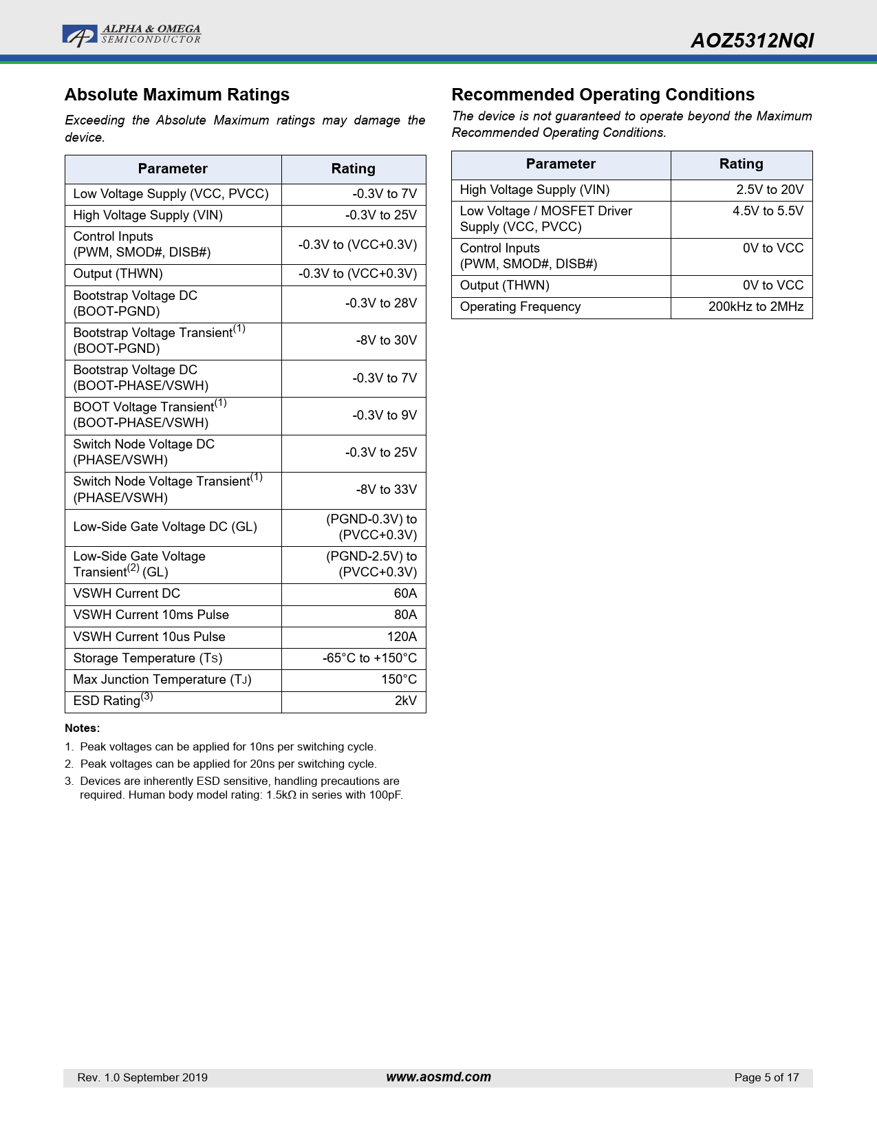 AOZ5312NQI. Absolute Maximum Ratings. Recommended Operating Conditions. Parameter. Rating. Notes:. www.aosmd.com