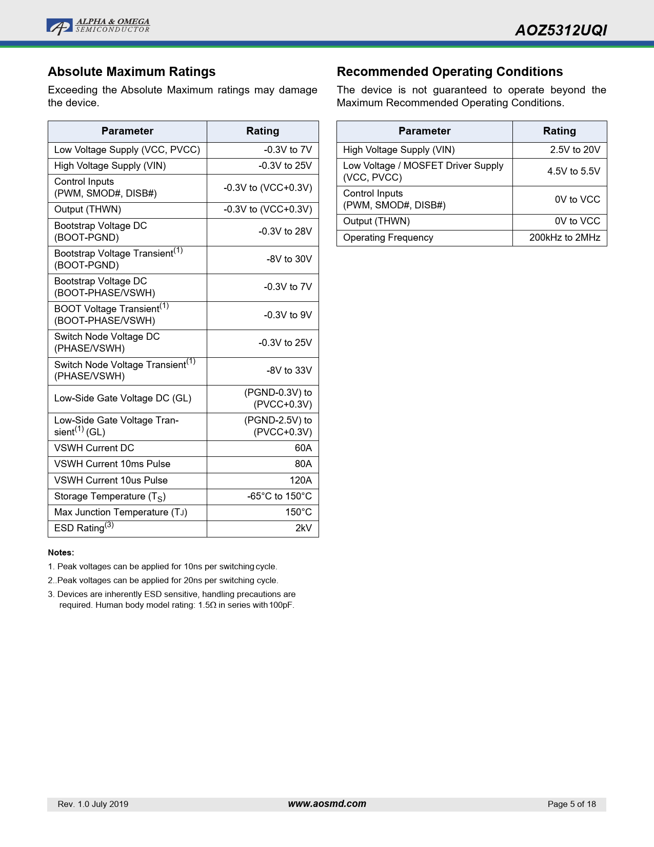 AOZ5312UQI. Absolute Maximum Ratings. Recommended Operating Conditions. Parameter. Rating. Notes:. www.aosmd.com