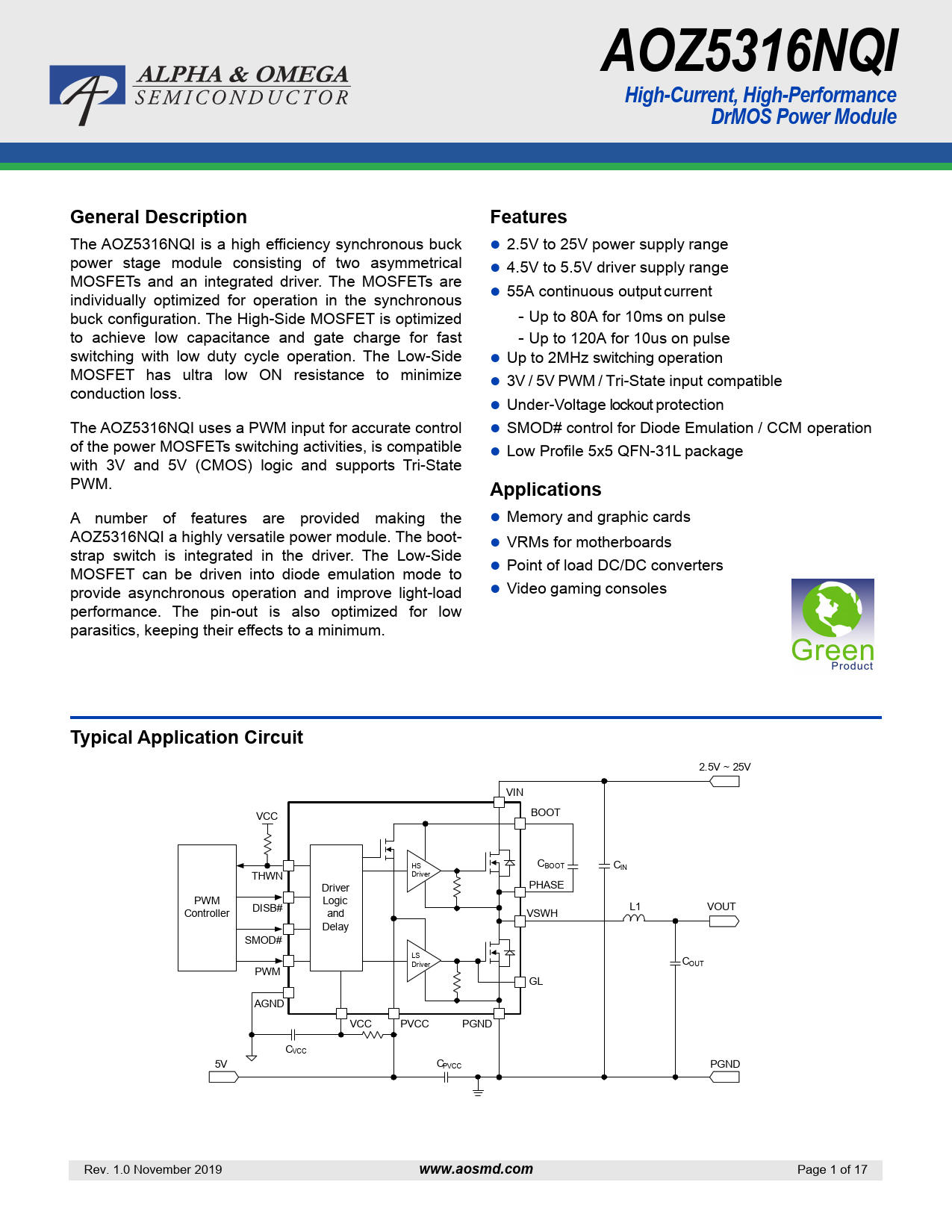 The AOZ5316NQI is a high efficiency synchronous buck 2.5V to 25V power supply range power stage module consisting of two asymmetrical 4.5V to 5.5V driver supply range MOSFETs and an integrated driver. The MOSFETs are 55A continuous output current individually optimized for operation in the synchronous buck configuration. The High-Side MOSFET is optimized - Up to 80A for 10ms on pulse to achieve low capacitance and gate charge for fast - Up to 120A for 10us on pulse switching with low duty cycle operation. The Low-Side Up to 2MHz switching operation MOSFET has ultra low ON resistance to minimize 3V / 5V PWM / Tri-State input compatible conduction loss. Under-Voltage lockout protection The AOZ5316NQI uses a PWM input for accurate control SMOD# control for Diode Emulation / CCM operation of the power MOSFETs switching activities, is compatible Low Profile 5x5 QFN-31L package with 3V and 5V (CMOS) logic and supports Tri-State PWM.