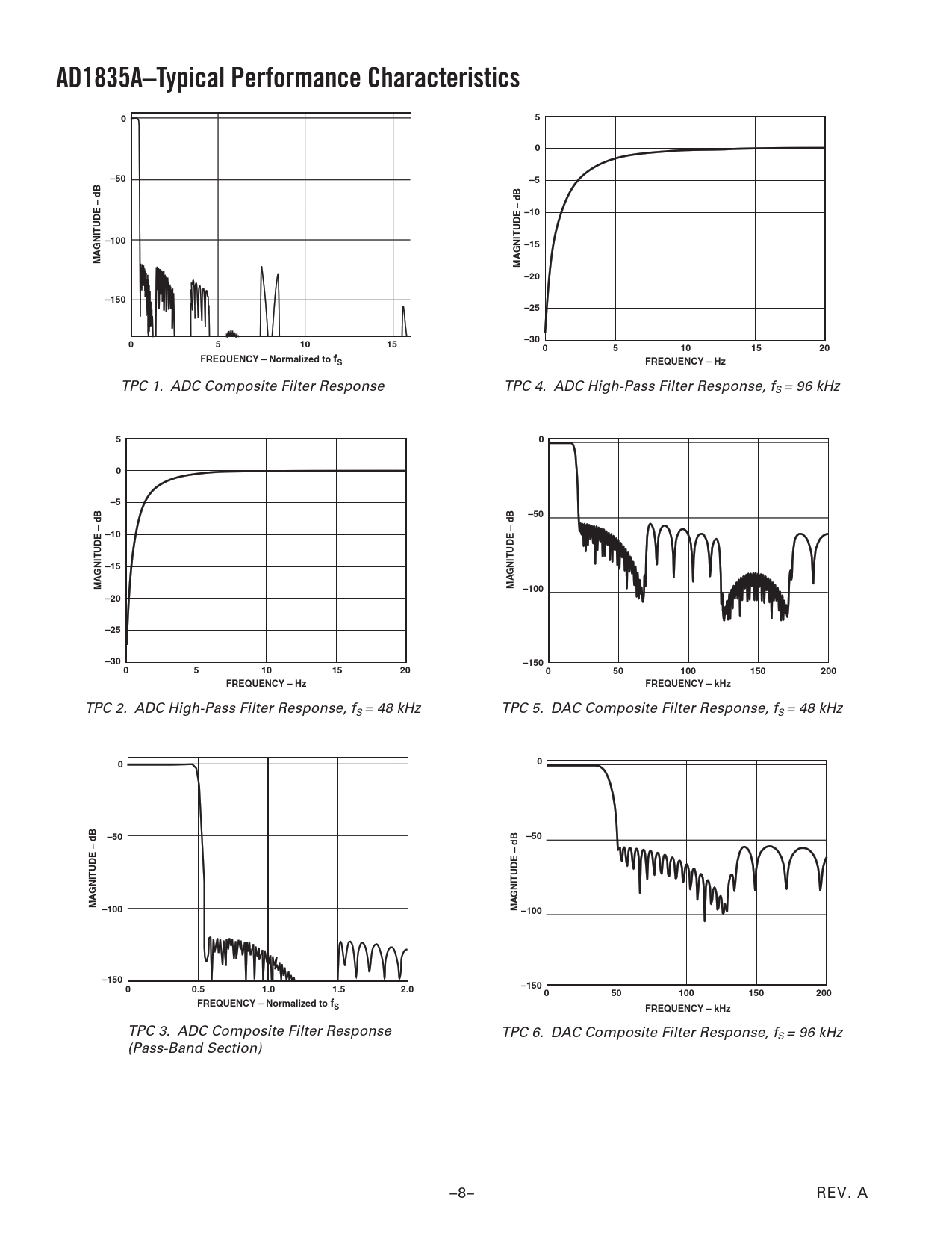 AD1835A–Typical Performance Characteristics 0 5 0 –50 –5 –10 –100 –15 MAGNITUDE – dB MAGNITUDE – dB –20 –150 –25 –30 0 5 10 15 0 5 10 15 20 FREQUENCY – Normalized to fS FREQUENCY – Hz