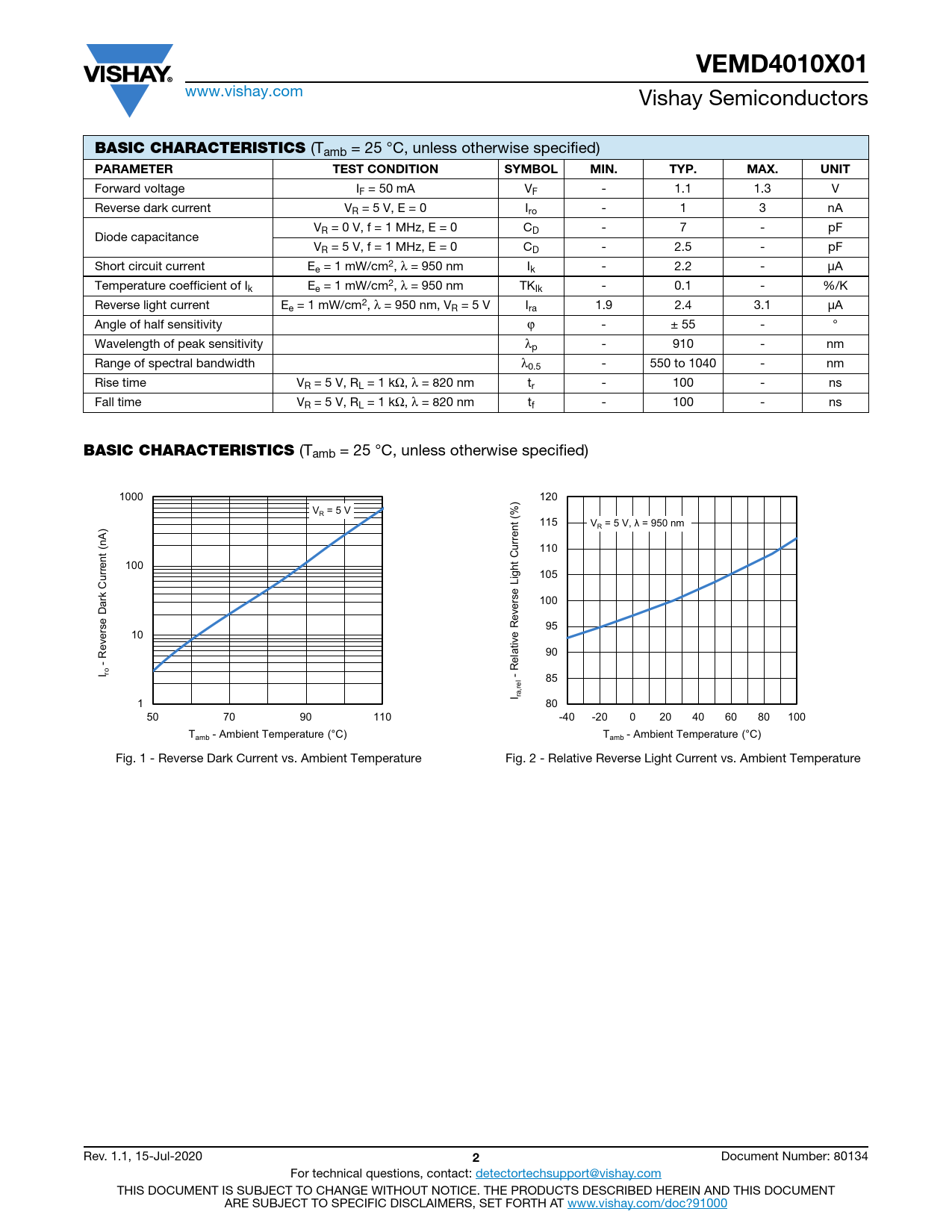 VEMD4010X01 www.vishay.com Vishay Semiconductors BASIC CHARACTERISTICS (Tamb = 25 °C, unless otherwise specified) PARAMETERTEST CONDITIONSYMBOLMIN.TYP.MAX.UNIT Forward voltage IF = 50 mA VF - 1.1 1.3 V Reverse dark current VR = 5 V, E = 0 Iro - 1 3 nA VR = 0 V, f = 1 MHz, E = 0 CD - 7 - pF Diode capacitance VR = 5 V, f = 1 MHz, E = 0 CD - 2.5 - pF Short circuit current Ee = 1 mW/cm2, λ = 950 nm Ik - 2.2 - μA Temperature coefficient of Ik Ee = 1 mW/cm2, λ = 950 nm TKIk - 0.1 - %/K Reverse light current Ee = 1 mW/cm2, λ = 950 nm, VR = 5 V Ira 1.9 2.4 3.1 μA Angle of half sensitivity ϕ - ± 55 - ° Wavelength of peak sensitivity λp - 910 - nm Range of spectral bandwidth λ0.5 - 550 to 1040 - nm Rise time VR = 5 V, RL = 1 kΩ, λ = 820 nm tr - 100 - ns Fall time VR = 5 V, RL = 1 kΩ, λ = 820 nm tf - 100 - ns BASIC CHARACTERISTICS (Tamb = 25 °C, unless otherwise specified) Axis Title Axis Title 1000 10000 120 10000 ) V = 5 V R (% 115 V = 5 V, λ = 950 nm ) R (nA 110 100 1000 1000 rrent u 105 C ne ne ne ine ine ne rk a 100 1st li 2nd li 1st li 2nd l 2nd l 2nd li 95 10 100 100 everse D R 90 - Relative Reverse Light Current I ro - l 85 ,re I ra 1 10 80 10 50 70 90 110 -40 -20 0 20 40 60 80 100 T - Ambient Temperature (°C) T - Ambient Temperature (°C) amb amb Fig. 1 - Reverse Dark Current vs. Ambient Temperature Fig. 2 - Relative Reverse Light Current vs. Ambient Temperature Rev. 1.1, 15-Jul-2020 2 Document Number: 80134 For technical questions, contact: detectortechsupport@vishay.com THIS DOCUMENT IS SUBJECT TO CHANGE WITHOUT NOTICE. THE PRODUCTS DESCRIBED HEREIN AND THIS DOCUMENT ARE SUBJECT TO SPECIFIC DISCLAIMERS, SET FORTH AT www.vishay.com/doc?91000
