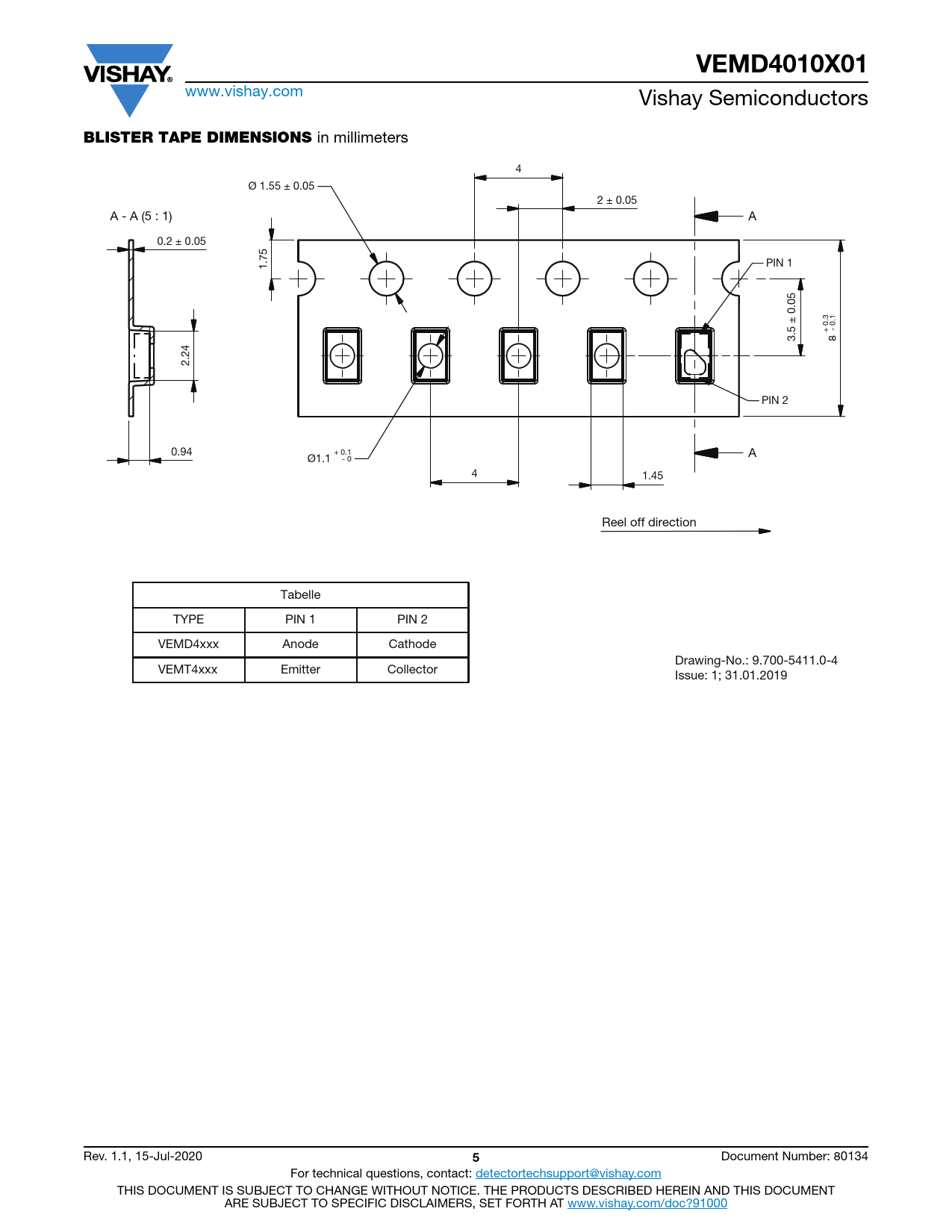 in millimeters 4 Ø 1.55 ± 0.05 2 ± 0.05 A - A (5 : 1) A 0.2 ± 0.05 PIN 1 1.75 + 0.3 - 0.1 3.5 ± 0.05 8 2.24 PIN 2 0.94 + 0.1 A Ø1.1 - 0 4 1.45 Reel off direction Tabelle TYPE PIN 1 PIN 2 VEMD4xxx Anode Cathode Drawing-No.: 9.700-5411.0-4 VEMT4xxx Emitter Collector Issue: 1; 31.01.2019 Rev. 1.1, 15-Jul-2020