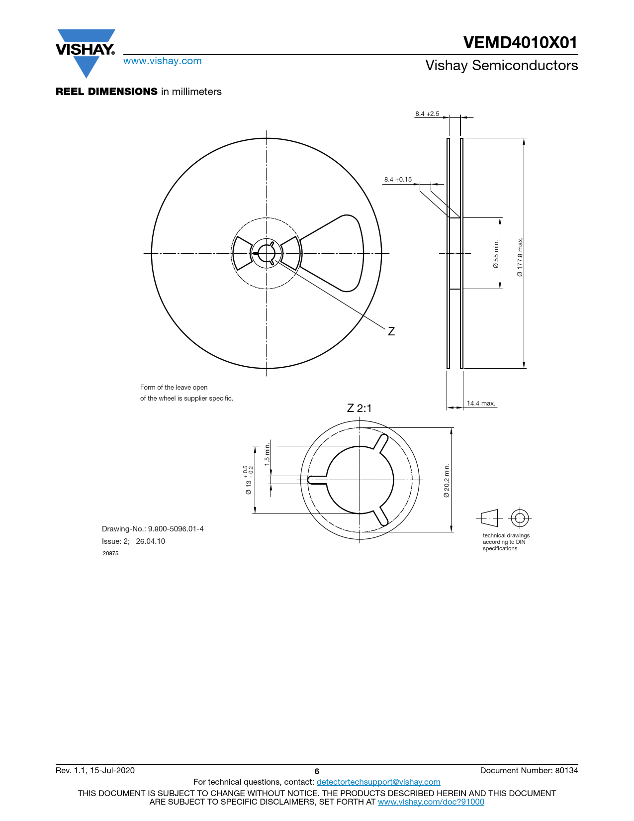 VEMD4010X01 www.vishay.com Vishay Semiconductors REEL DIMENSIONS in millimeters 8.4 +2.5 8.4 +0.15 Ø 55 min. Ø 177.8 max. Z Form of the leave open of the wheel is supplier specific. 14.4 max. Z 2:1 1.5 min. + 0.5 - 0.2 Ø 13 Ø 20.2 min. Drawing-No.: 9.800-5096.01-4 technical drawings Issue: 2; 26.04.10 according to DIN specifications 20875 Rev. 1.1, 15-Jul-2020 6 Document Number: 80134 For technical questions, contact: detectortechsupport@vishay.com THIS DOCUMENT IS SUBJECT TO CHANGE WITHOUT NOTICE. THE PRODUCTS DESCRIBED HEREIN AND THIS DOCUMENT ARE SUBJECT TO SPECIFIC DISCLAIMERS, SET FORTH AT www.vishay.com/doc?91000