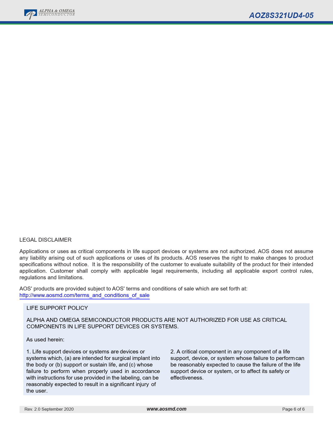 ALPHA & OMEGA S E M I C O N D U C T O R AOZ8S321UD4-05 LEGAL DISCLAIMER Applications or uses as critical components in life support devices or systems are not authorized. AOS does not assume any liability arising out of such applications or uses of its products. AOS reserves the right to make changes to product specifications without notice. It is the responsibility of the customer to evaluate suitability of the product for their intended application. Customer shall comply with applicable legal requirements, including all applicable export control rules, regulations and limitations. AOS' products are provided subject to AOS' terms and conditions of sale which are set forth at: http://www.aosmd.com/terms_and_conditions_of_sale LIFE SUPPORT POLICY ALPHA AND OMEGA SEMICONDUCTOR PRODUCTS ARE NOT AUTHORIZED FOR USE AS CRITICAL COMPONENTS IN LIFE SUPPORT DEVICES OR SYSTEMS. As used herein: 1. Life support devices or systems are devices or 2. A critical component in any component of a life systems which, (a) are intended for surgical implant into support, device, or system whose failure to perform can the body or (b) support or sustain life, and (c) whose be reasonably expected to cause the failure of the life failure to perform when properly used in accordance support device or system, or to affect its safety or with instructions for use provided in the labeling, can be effectiveness. reasonably expected to result in a significant injury of the user. Rev. 2.0 September 2020 www.aosmd.com Page 6 of 6