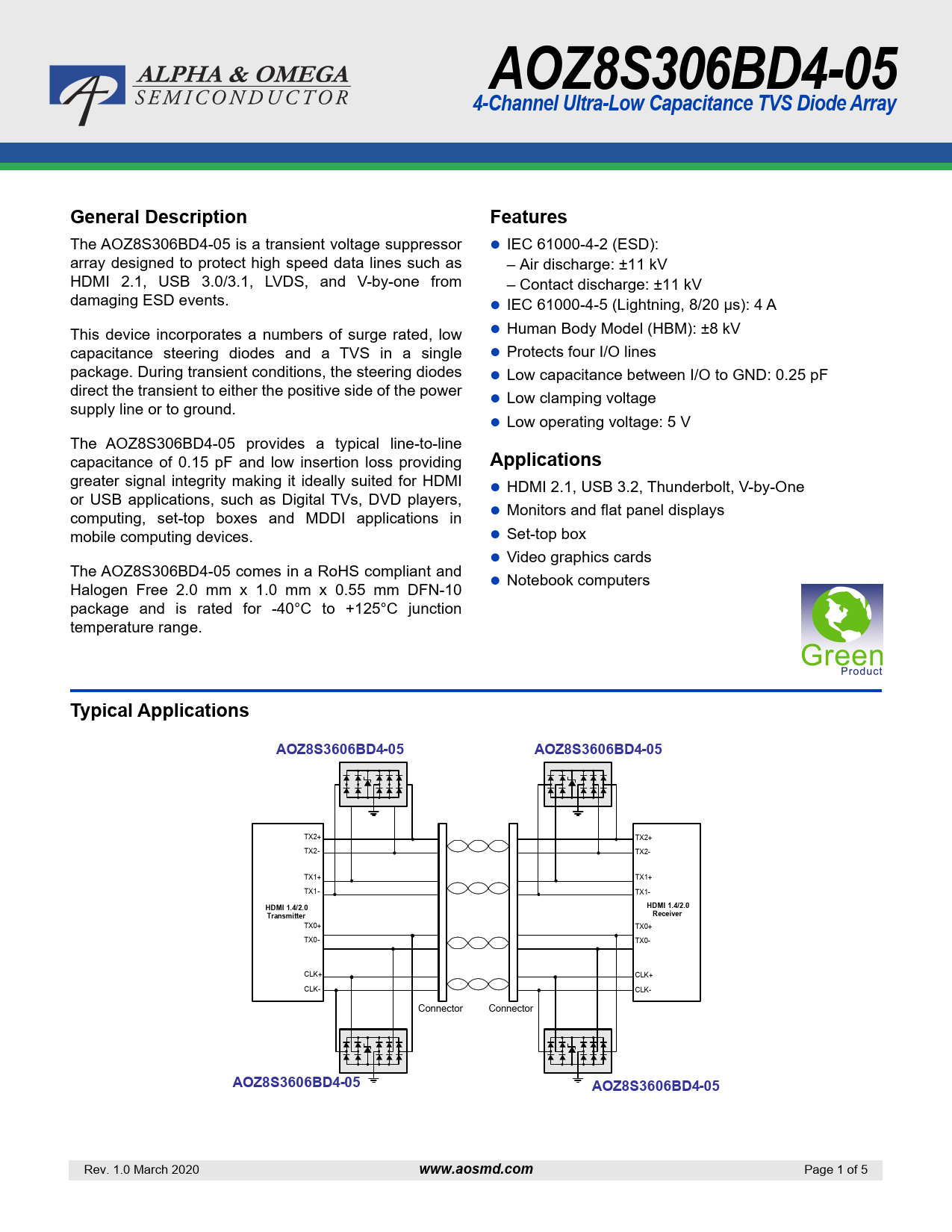 AOZ8S306BD4-054-Channel Ultra-Low Capacitance TVS Diode ArrayGeneral DescriptionFeatures The AOZ8S306BD4-05 is a transient voltage suppressor IEC 61000-4-2 (ESD): array designed to protect high speed data lines such as – Air discharge: ±11 kV HDMI 2.1, USB 3.0/3.1, LVDS, and V-by-one from – Contact discharge: ±11 kV damaging ESD events. IEC 61000-4-5 (Lightning, 8/20 μs): 4 A This device incorporates a numbers of surge rated, low Human Body Model (HBM): ±8 kV capacitance steering diodes and a TVS in a single Protects four I/O lines package. During transient conditions, the steering diodes Low capacitance between I/O to GND: 0.25 pF direct the transient to either the positive side of the power supply line or to ground. Low clamping voltage Low operating voltage: 5 V The AOZ8S306BD4-05 provides a typical line-to-line capacitance of 0.15 pF and low insertion loss providing Applications greater signal integrity making it ideally suited for HDMI HDMI 2.1, USB 3.2, Thunderbolt, V-by-One or USB applications, such as Digital TVs, DVD players, computing, set-top boxes and MDDI applications in Monitors and flat panel displays mobile computing devices. Set-top box Video graphics cards The AOZ8S306BD4-05 comes in a RoHS compliant and Halogen Free 2.0 mm x 1.0 mm x 0.55 mm DFN-10 Notebook computers package and is rated for -40°C to +125°C junction temperature range. Typical ApplicationsAOZ8S3606BD4-05AOZ8S3606BD4-05 TX2+ TX2+ TX2- TX2- TX1+ TX1+ TX1- TX1- HDMI 1.4/2.0HDMI 1.4/2.0TransmitterReceiver TX0+ TX0+ TX0- TX0- CLK+ CLK+ CLK- CLK- Connector Connector AOZ8S3606BD4-05AOZ8S3606BD4-05 Rev. 1.0 March 2020 www.aosmd.com Page 1 of 5