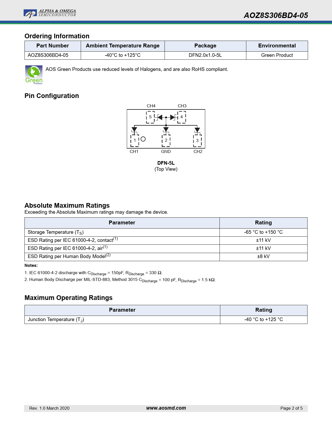 AOZ8S306BD4-05 -40°C to +125°C DFN2.0x1.0-5L Green Product AOS Green Products use reduced levels of Halogens, and are also RoHS compliant.