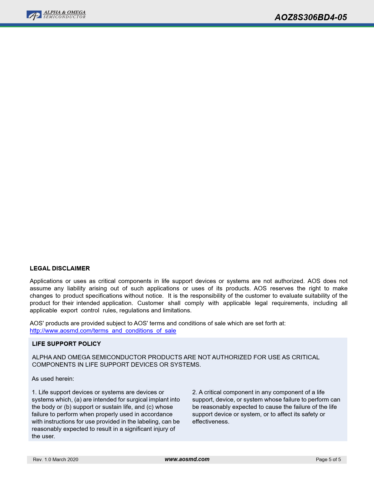 Seiten / Seite5 / 5 — AOZ8S306BD4-05. LEGAL DISCLAIMER. LIFE SUPPORT POLICY. www.aosmd.com
