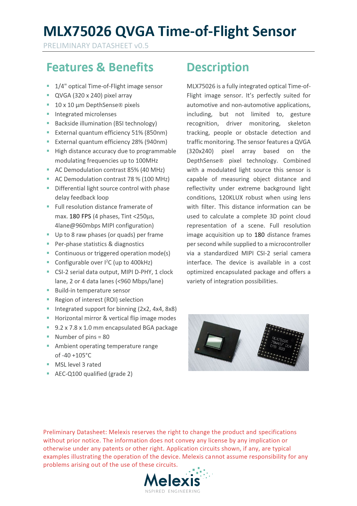 MLX75026 QVGA Time-of-Flight Sensor PRELIMINARY DATASHEET v0.5 Features & BenefitsDescription 1/4" optical Time-of-Flight image sensor MLX75026 is a fully integrated optical Time-of- QVGA (320 x 240) pixel array Flight image sensor. It’s perfectly suited for 10 x 10 µm DepthSense pixels automotive and non-automotive applications, Integrated microlenses including, but not limited to, gesture Backside illumination (BSI technology) recognition, driver monitoring, skeleton External quantum efficiency 51% (850nm) tracking, people or obstacle detection and External quantum efficiency 28% (940nm) traffic monitoring. The sensor features a QVGA High distance accuracy due to programmable (320x240) pixel array based on the modulating frequencies up to 100MHz DepthSense pixel technology. Combined AC Demodulation contrast 85% (40 MHz) with a modulated light source this sensor is AC Demodulation contrast 78 % (100 MHz) capable of measuring object distance and Differential light source control with phase reflectivity under extreme background light delay feedback loop conditions, 120KLUX robust when using lens Full resolution distance framerate of with filter. This distance information can be max. 180 FPS (4 phases, Tint <250µs, used to calculate a complete 3D point cloud 4lane@960mbps MIPI configuration) representation of a scene. Full resolution Up to 8 raw phases (or quads) per frame image acquisition up to 180 distance frames Per-phase statistics & diagnostics per second while supplied to a microcontroller Continuous or triggered operation mode(s) via a standardized MIPI CSI-2 serial camera Configurable over I2C (up to 400kHz) interface. The device is available in a cost CSI-2 serial data output, MIPI D-PHY, 1 clock optimized encapsulated package and offers a lane, 2 or 4 data lanes (<960 Mbps/lane) variety of integration possibilities. Build-in temperature sensor Region of interest (ROI) selection Integrated support for binning (2x2, 4x4, 8x8) Horizontal mirror & vertical flip image modes 9.2 x 7.8 x 1.0 mm encapsulated BGA package Number of pins = 80 Ambient operating temperature range of -40 +105°C MSL level 3 rated AEC-Q100 qualified (grade 2) Preliminary Datasheet: Melexis reserves the right to change the product and specifications without prior notice. The information does not convey any license by any implication or otherwise under any patents or other right. Application circuits shown, if any, are typical examples illustrating the operation of the device. Melexis cannot assume responsibility for any problems arising out of the use of these circuits. Document Outline Table of Contents Document Revision History Ordering Information 1. System Architecture 2. Sensor Block Diagram 3. Electrical Specifications 3.1. Absolute Maximum Ratings 3.2. Typical Operating Conditions 3.3. Video Interface 3.3.1. MIPI DC specification 3.3.2. MIPI AC specification 3.4. Power Consumption 3.5. Maximum Distance Frame Rate 3.6. Decoupling Recommendations 3.7. Power-up Sequence 3.8. Input Clock Requirements 3.9. I2C Specifications 4. Optical Characteristics 4.1. QVGA Pixel Array Configuration 4.2. Pixel & Image Array Characteristics 4.3. CRA (Chief Ray Angle) 4.4. MTF (Modulation Transfer Function) 4.5. Application Lens Design Recommendations 5. Communication Interface(s) 5.1. I2C (Inter-Integrated Circuit) 5.1.1. I2C Timing Sequence 5.1.2. Single I2C Read 5.1.3. Sequential I2C Read 5.1.4. Single I2C Write 5.1.5. Sequential I2C Write 5.1.6. I2C Slave Address 5.2. MIPI Alliance CSI-2 Description 5.2.1. Packet Structure 5.2.2. Data Format RAW12 5.2.2.1. Data Format in 4 Lane MIPI Configuration 5.2.2.2. Data Format in 2 Lane MIPI Configuration 6. Start-up Sequence 6.1. Initialization Process 6.2. Initialization Register Map 7. Register Settings 7.1. Video Output Configuration 7.2. Modes of Operation 7.3. Data Output Modes 7.4. HMAX & Frame Read-Out Time 7.4.1. PLLSSETUP 7.4.2. PRETIME 7.4.3. RANDNM0 7.5. PARAM_HOLD 7.6. USER_ID Register 7.7. Modulation Frequency 7.8. Frame Structure & Frame Rate 7.9. FRAME_STARTUP 7.10. FRAME_TIME 7.11. PHASE_COUNT 7.12. Px_PREHEAT, Px_PREMIX 7.13. Px_INTEGRATION 7.14. Px_PHASE_SHIFT 7.15. Px_PHASE_IDLE (or V-blanking) 7.16. Px_LEDEN 7.17. Px_DMIX0, Px_DMIX1 & Px_STATIC_LED 7.18. Analog Delay Setting 7.18.1. Coarse Delay 7.18.2. Fine Delay 7.18.3. Super Fine 7.19. Pixel Binning 7.20. Region of Interest (ROI) 7.21. Flip & Mirror 7.22. Temperature Sensor 7.23. Pixel & Phase Statistics 7.24. PN9 Test Pattern 7.25. Duty Cycle Adjustment 7.26. Illumination Signal (subLVDS or CMOS) 8. MetaData Description 8.1. Embedded Data Format in 4 Lane MIPI Configuration 8.2. Embedded Data Format in 2 Lane MIPI Configuration 9. Distance & Amplitude Calculation 10. Package Outline 10.1. Pinout & Equivalent I/O Circuitry 10.2. Mechanical Dimensions 10.3. PCB Landing Pattern & Layout Recommendations 10.4. Package Marking 10.5. Cover Tape Removal Disclaimer