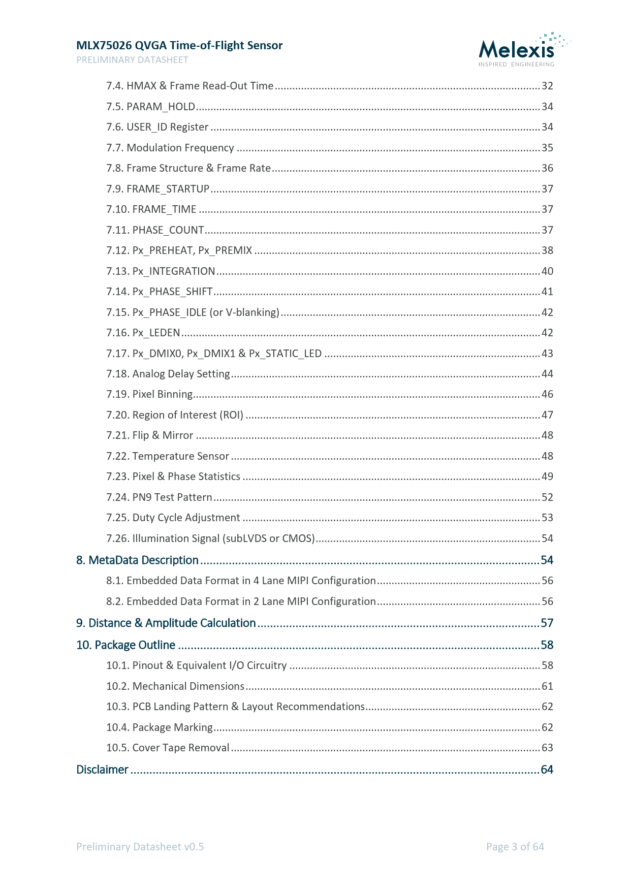 PRELIMINARY DATASHEET 7.4. HMAX & Frame Read-Out Time ... 32 7.5. PARAM_HOLD .. 34 7.6. USER_ID Register ... 34 7.7. Modulation Frequency .. 35 7.8. Frame Structure & Frame Rate .. 36 7.9. FRAME_STARTUP ... 37 7.10. FRAME_TIME ... 37 7.11. PHASE_COUNT ... 37 7.12. Px_PREHEAT, Px_PREMIX .. 38 7.13. Px_INTEGRATION ... 40 7.14. Px_PHASE_SHIFT .. 41 7.15. Px_PHASE_IDLE (or V-blanking) ... 42 7.16. Px_LEDEN ... 42 7.17. Px_DMIX0, Px_DMIX1 & Px_STATIC_LED .. 43 7.18. Analog Delay Setting .. 44 7.19. Pixel Binning ... 46 7.20. Region of Interest (ROI) ... 47 7.21. Flip & Mirror .. 48 7.22. Temperature Sensor .. 48 7.23. Pixel & Phase Statistics .. 49 7.24. PN9 Test Pattern .. 52 7.25. Duty Cycle Adjustment .. 53 7.26. Illumination Signal (subLVDS or CMOS) ... 54 8. MetaData Description ... 54 8.1. Embedded Data Format in 4 Lane MIPI Configuration .. 56 8.2. Embedded Data Format in 2 Lane MIPI Configuration .. 56 9. Distance & Amplitude Calculation ... 57 10. Package Outline .. 58 10.1. Pinout & Equivalent I/O Circuitry .. 58 10.2. Mechanical Dimensions ... 61 10.3. PCB Landing Pattern & Layout Recommendations .. 62 10.4. Package Marking .. 62 10.5. Cover Tape Removal .. 63 Disclaimer ... 64 Preliminary Datasheet v0.5 Page 3 of 64 Document Outline Table of Contents Document Revision History Ordering Information 1. System Architecture 2. Sensor Block Diagram 3. Electrical Specifications 3.1. Absolute Maximum Ratings 3.2. Typical Operating Conditions 3.3. Video Interface 3.3.1. MIPI DC specification 3.3.2. MIPI AC specification 3.4. Power Consumption 3.5. Maximum Distance Frame Rate 3.6. Decoupling Recommendations 3.7. Power-up Sequence 3.8. Input Clock Requirements 3.9. I2C Specifications 4. Optical Characteristics 4.1. QVGA Pixel Array Configuration 4.2. Pixel & Image Array Characteristics 4.3. CRA (Chief Ray Angle) 4.4. MTF (Modulation Transfer Function) 4.5. Application Lens Design Recommendations 5. Communication Interface(s) 5.1. I2C (Inter-Integrated Circuit) 5.1.1. I2C Timing Sequence 5.1.2. Single I2C Read 5.1.3. Sequential I2C Read 5.1.4. Single I2C Write 5.1.5. Sequential I2C Write 5.1.6. I2C Slave Address 5.2. MIPI Alliance CSI-2 Description 5.2.1. Packet Structure 5.2.2. Data Format RAW12 5.2.2.1. Data Format in 4 Lane MIPI Configuration 5.2.2.2. Data Format in 2 Lane MIPI Configuration 6. Start-up Sequence 6.1. Initialization Process 6.2. Initialization Register Map 7. Register Settings 7.1. Video Output Configuration 7.2. Modes of Operation 7.3. Data Output Modes 7.4. HMAX & Frame Read-Out Time 7.4.1. PLLSSETUP 7.4.2. PRETIME 7.4.3. RANDNM0 7.5. PARAM_HOLD 7.6. USER_ID Register 7.7. Modulation Frequency 7.8. Frame Structure & Frame Rate 7.9. FRAME_STARTUP 7.10. FRAME_TIME 7.11. PHASE_COUNT 7.12. Px_PREHEAT, Px_PREMIX 7.13. Px_INTEGRATION 7.14. Px_PHASE_SHIFT 7.15. Px_PHASE_IDLE (or V-blanking) 7.16. Px_LEDEN 7.17. Px_DMIX0, Px_DMIX1 & Px_STATIC_LED 7.18. Analog Delay Setting 7.18.1. Coarse Delay 7.18.2. Fine Delay 7.18.3. Super Fine 7.19. Pixel Binning 7.20. Region of Interest (ROI) 7.21. Flip & Mirror 7.22. Temperature Sensor 7.23. Pixel & Phase Statistics 7.24. PN9 Test Pattern 7.25. Duty Cycle Adjustment 7.26. Illumination Signal (subLVDS or CMOS) 8. MetaData Description 8.1. Embedded Data Format in 4 Lane MIPI Configuration 8.2. Embedded Data Format in 2 Lane MIPI Configuration 9. Distance & Amplitude Calculation 10. Package Outline 10.1. Pinout & Equivalent I/O Circuitry 10.2. Mechanical Dimensions 10.3. PCB Landing Pattern & Layout Recommendations 10.4. Package Marking 10.5. Cover Tape Removal Disclaimer