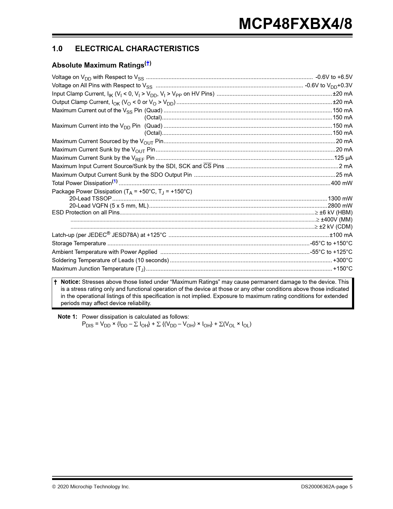 MCP48FXBX4/8. 1.0. ELECTRICAL CHARACTERISTICS. Absolute Maximum Ratings(†. † Notice:. Note 1: