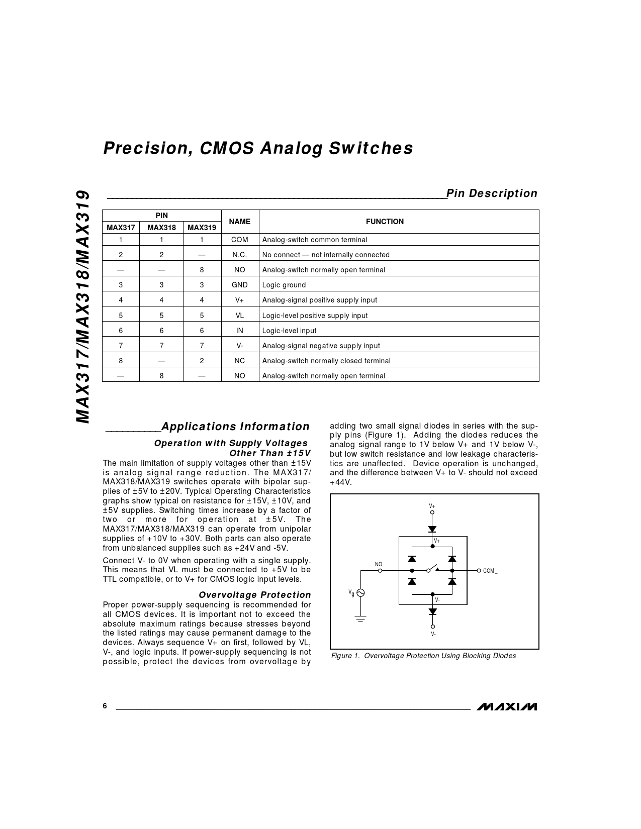 Precision, CMOS Analog Switches_______________________________________________________________________Pin DescriptionPINNAMEFUNCTIONMAX317MAX318MAX319 1 1 1 COM Analog-switch common terminal 2 2 — N.C. No connect — not internally connected — — 8 NO Analog-switch normally open terminal 3 3 3 GND Logic ground 4 4 4 V+ Analog-signal positive supply input 5 5 5 VL Logic-level positive supply input 6 6 6 IN Logic-level input 7 7 7 V- Analog-signal negative supply input 8 — 2 NC Analog-switch normally closed terminal — 8 — NO Analog-switch normally open terminal MAX317/MAX318/MAX319__________Applications Information adding two small signal diodes in series with the sup- ply pins (Figure 1). Adding the diodes reduces the Operation with Supply Voltages analog signal range to 1V below V+ and 1V below V-, Other Than ±15V but low switch resistance and low leakage characteris- The main limitation of supply voltages other than ±15V tics are unaffected. Device operation is unchanged, is analog signal range reduction. The MAX317/ and the difference between V+ to V- should not exceed MAX318/MAX319 switches operate with bipolar sup- +44V. plies of ±5V to ±20V. Typical Operating Characteristics graphs show typical on resistance for ±15V, ±10V, and V+ ±5V supplies. Switching times increase by a factor of two or more for operation at ±5V. The MAX317/MAX318/MAX319 can operate from unipolar supplies of +10V to +30V. Both parts can also operate V+ from unbalanced supplies such as +24V and -5V. Connect V- to 0V when operating with a single supply. NO_ This means that VL must be connected to +5V to be COM_ TTL compatible, or to V+ for CMOS logic input levels. Overvoltage Protection Vg V- Proper power-supply sequencing is recommended for all CMOS devices. It is important not to exceed the absolute maximum ratings because stresses beyond the listed ratings may cause permanent damage to the V- devices. Always sequence V+ on first, followed by VL, V-, and logic inputs. If power-supply sequencing is not Figure 1. Overvoltage Protection Using Blocking Diodes possible, protect the devices from overvoltage by 6_______________________________________________________________________________________