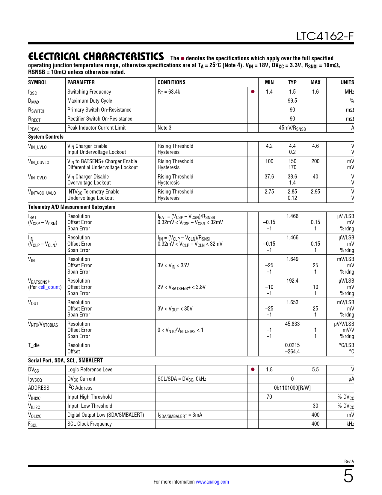 DVCC Logic Reference Level l 1.8 5.5 V IDVCCQ DVCC Current SCL/SDA = DVCC, 0kHz 0 µA ADDRESS I2C Address 0b1101000[R/W] VIHI2C Input High Threshold 70 % DVCC VILI2C Input Low Threshold 30 % DVCC VOLI2C Digital Output Low (SDA/SMBALERT) ISDA/SMBALERT = 3mA 400 mV FSCL SCL Clock Frequency 400 kHz Rev A For more information www.analog.com 5 Document Outline Features Applications Typical Application Description Absolute Maximum Ratings Order Information Pin Configuration Electrical Characteristics Typical Performance Characteristics Pin Functions Block Diagram ESD Diagram Timing Diagram Operation Applications Information Register Descriptions Typical Applications Package Description Revision History Typical Application Related Parts