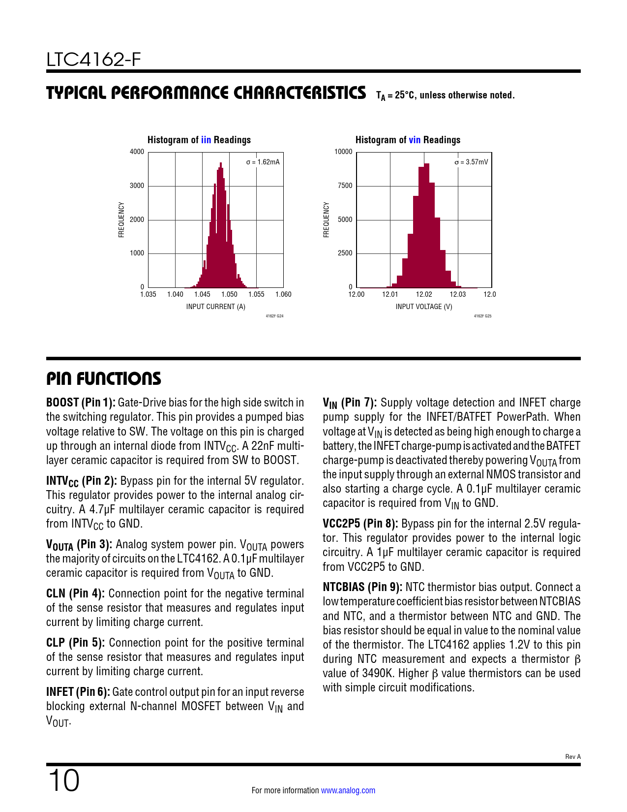 link to page 46 link to page 45 LTC4162-F TYPICAL PERFORMANCE CHARACTERISTICS TA = 25°C, unless otherwise noted.Histogram of iinReadingsHistogram of vinReadings 4000 10000 σ = 1.62mA σ = 3.57mV 3000 7500 2000 5000 FREQUENCY FREQUENCY 1000 2500 0 0 1.035 1.040 1.045 1.050 1.055 1.060 12.00 12.01 12.02 12.03 12.04 INPUT CURRENT (A) INPUT VOLTAGE (V) 4162F G24 4162F G25 PIN FUNCTIONS BOOST (Pin 1): Gate-Drive bias for the high side switch in VIN (Pin 7): Supply voltage detection and INFET charge the switching regulator. This pin provides a pumped bias pump supply for the INFET/BATFET PowerPath. When voltage relative to SW. The voltage on this pin is charged voltage at VIN is detected as being high enough to charge a up through an internal diode from INTVCC. A 22nF multi- battery, the INFET charge-pump is activated and the BATFET layer ceramic capacitor is required from SW to BOOST. charge-pump is deactivated thereby powering VOUTA from INTV the input supply through an external NMOS transistor and CC (Pin 2): Bypass pin for the internal 5V regulator. This regulator provides power to the internal analog cir- also starting a charge cycle. A 0.1µF multilayer ceramic cuitry. A 4.7µF multilayer ceramic capacitor is required capacitor is required from VIN to GND. from INTVCC to GND. VCC2P5 (Pin 8): Bypass pin for the internal 2.5V regula- V tor. This regulator provides power to the internal logic OUTA (Pin 3): Analog system power pin. VOUTA powers the majority of circuits on the LTC4162. A 0.1µF multilayer circuitry. A 1µF multilayer ceramic capacitor is required ceramic capacitor is required from V from VCC2P5 to GND. OUTA to GND. CLN (Pin 4): Connection point for the negative terminal NTCBIAS (Pin 9): NTC thermistor bias output. Connect a of the sense resistor that measures and regulates input low temperature coefficient bias resistor between NTCBIAS current by limiting charge current. and NTC, and a thermistor between NTC and GND. The bias resistor should be equal in value to the nominal value CLP (Pin 5): Connection point for the positive terminal of the thermistor. The LTC4162 applies 1.2V to this pin of the sense resistor that measures and regulates input during NTC measurement and expects a thermistor β current by limiting charge current. value of 3490K. Higher β value thermistors can be used INFET (Pin 6): Gate control output pin for an input reverse with simple circuit modifications. blocking external N-channel MOSFET between VIN and VOUT. Rev A 10 For more information www.analog.com Document Outline Features Applications Typical Application Description Absolute Maximum Ratings Order Information Pin Configuration Electrical Characteristics Typical Performance Characteristics Pin Functions Block Diagram ESD Diagram Timing Diagram Operation Applications Information Register Descriptions Typical Applications Package Description Revision History Typical Application Related Parts