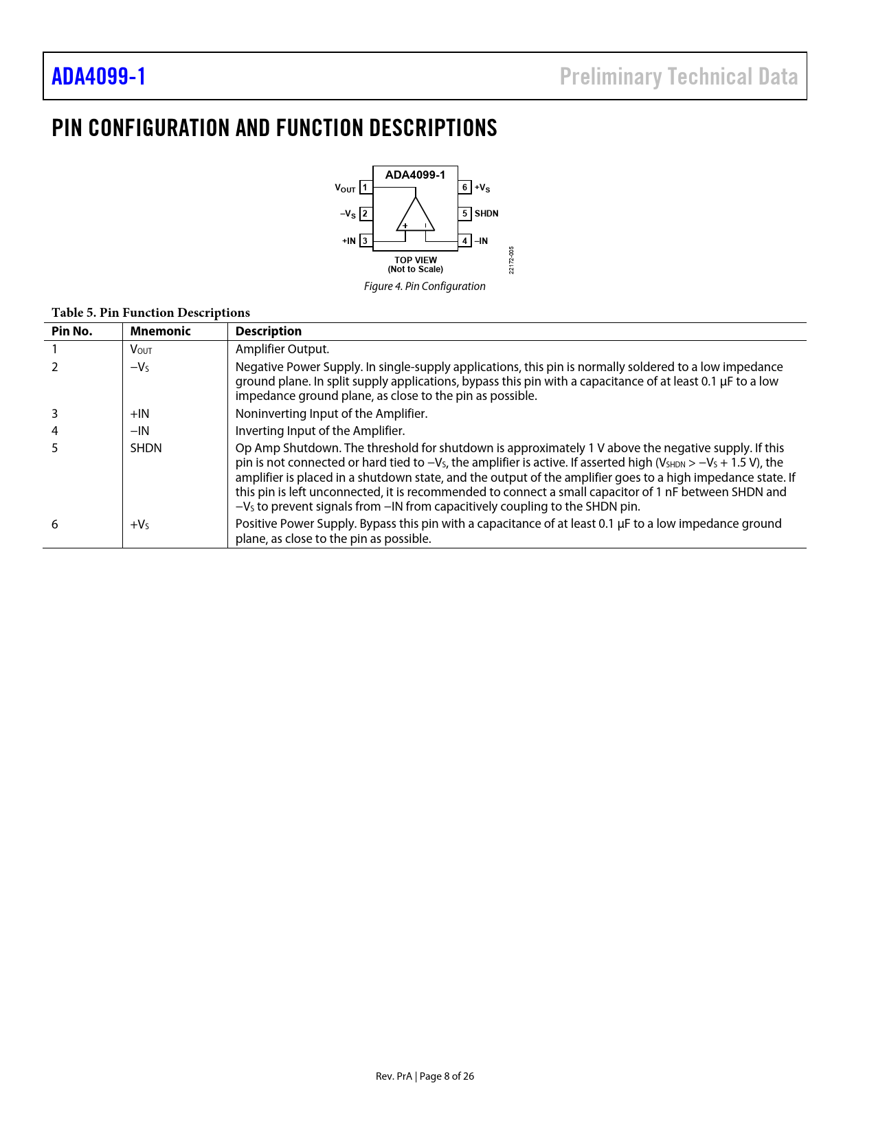 ADA4099-1. Preliminary Technical Data. PIN CONFIGURATION AND FUNCTION DESCRIPTIONS. OUT. 6 +VS. 5 SHDN. +IN 3. 4 –IN. TOP VIEW