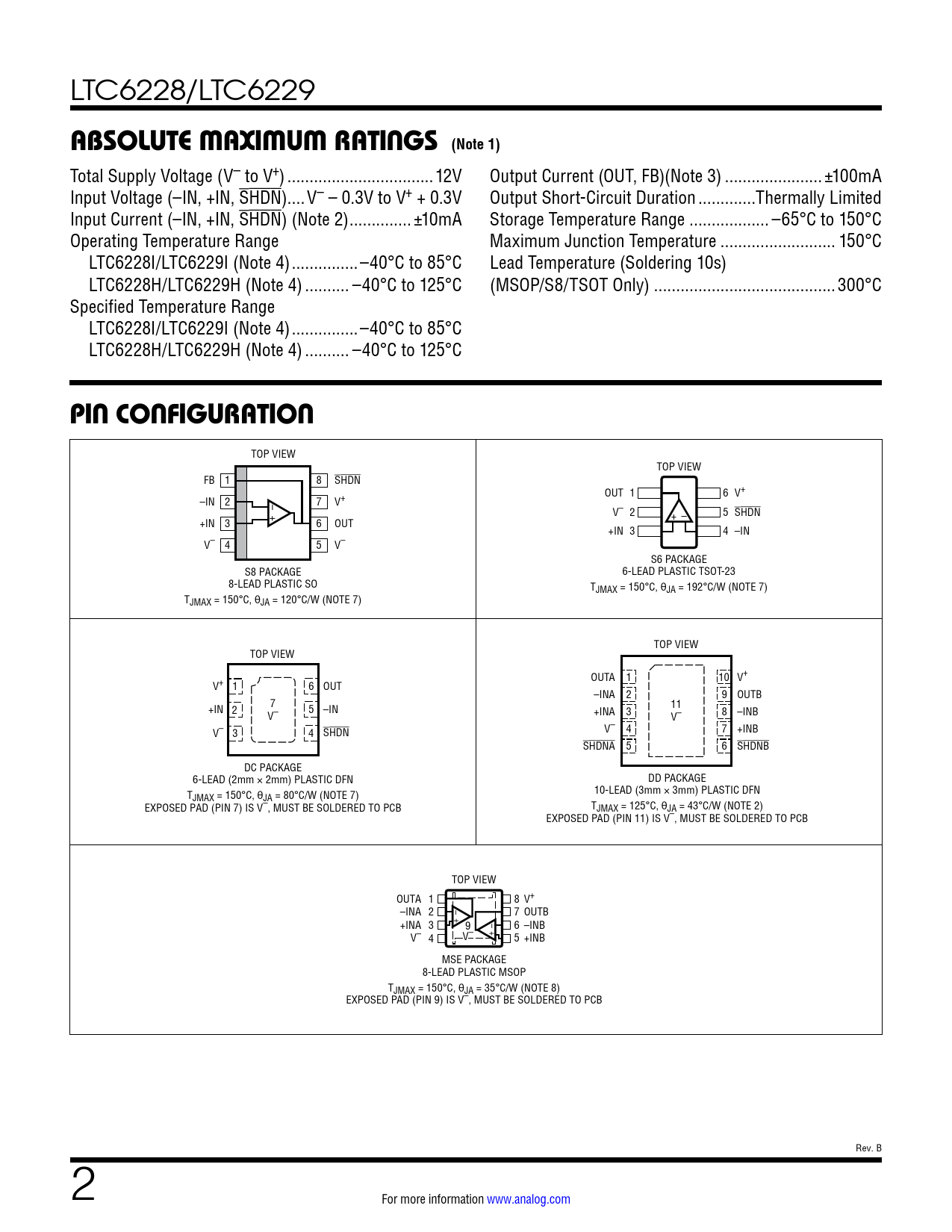 Total Supply Voltage (V– to V+) ...12V Output Current (OUT, FB)(Note 3) ..±100mA Input Voltage (–IN, +IN, SHDN)..V– – 0.3V to V+ + 0.3V Output Short-Circuit Duration ...Thermally Limited Input Current (–IN, +IN, SHDN) (Note 2) .. ±10mA Storage Temperature Range .. –65°C to 150°C Operating Temperature Range Maximum Junction Temperature .. 150°C LTC6228I/LTC6229I (Note 4) ...–40°C to 85°C Lead Temperature (Soldering 10s) LTC6228H/LTC6229H (Note 4) .. –40°C to 125°C (MSOP/S8/TSOT Only) ...300°C Specified Temperature Range LTC6228I/LTC6229I (Note 4) ...–40°C to 85°C LTC6228H/LTC6229H (Note 4) .. –40°C to 125°C