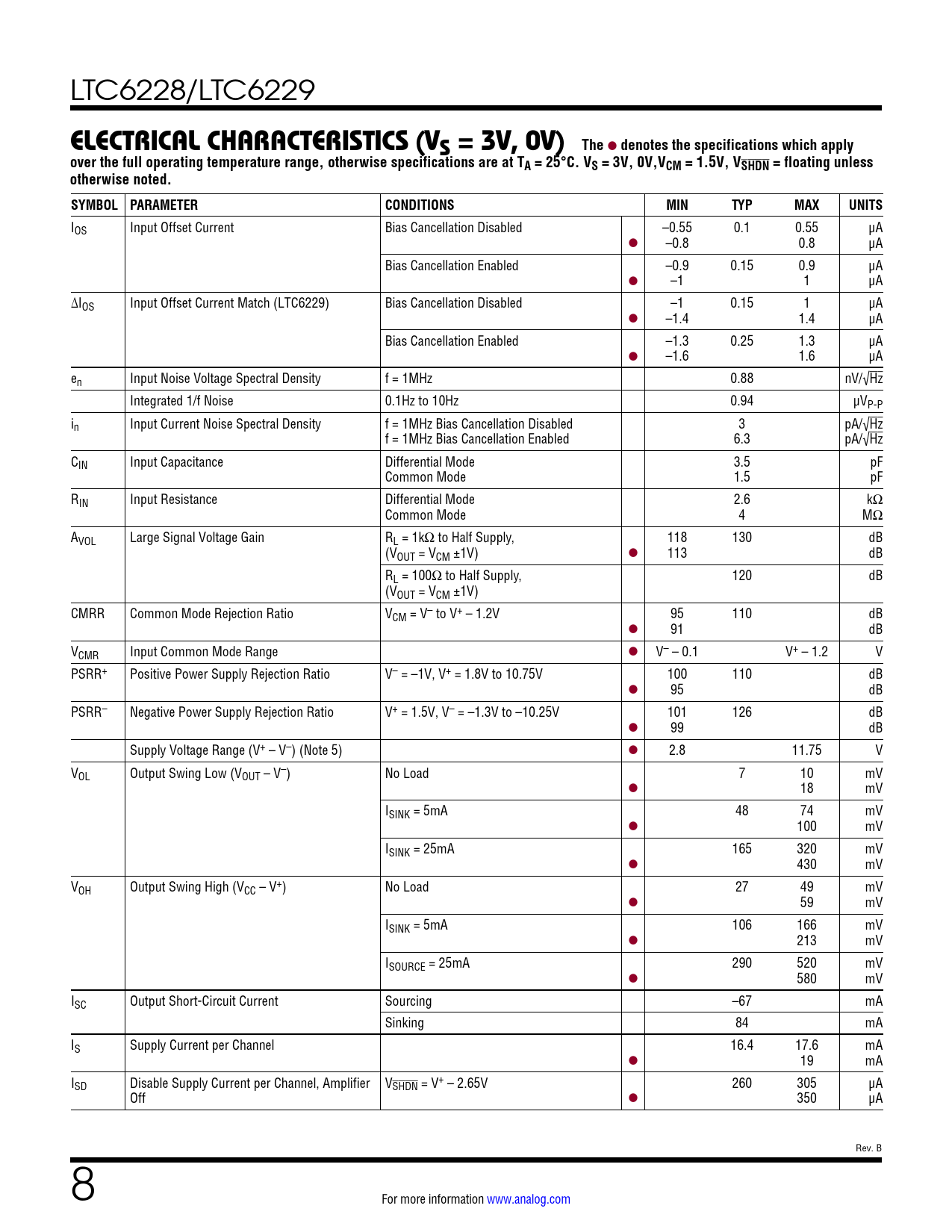 LTC6228/LTC6229 ELECTRICAL CHARACTERISTICS (VThe l denotes the specifications which applyS = 3V, 0V)over the full operating temperature range, otherwise specifications are at TA = 25°C. VS = 3V, 0V,VCM = 1.5V, VSHDN = floating unlessotherwise noted.SYMBOL PARAMETERCONDITIONSMINTYPMAXUNITS IOS Input Offset Current Bias Cancellation Disabled –0.55 0.1 0.55 μA l –0.8 0.8 μA Bias Cancellation Enabled –0.9 0.15 0.9 μA l –1 1 μA ∆IOS Input Offset Current Match (LTC6229) Bias Cancellation Disabled –1 0.15 1 µA l –1.4 1.4 µA Bias Cancellation Enabled –1.3 0.25 1.3 µA l –1.6 1.6 µA en Input Noise Voltage Spectral Density f = 1MHz 0.88 nV/√Hz Integrated 1/f Noise 0.1Hz to 10Hz 0.94 μVP-P in Input Current Noise Spectral Density f = 1MHz Bias Cancellation Disabled 3 pA/√Hz f = 1MHz Bias Cancellation Enabled 6.3 pA/√Hz CIN Input Capacitance Differential Mode 3.5 pF Common Mode 1.5 pF RIN Input Resistance Differential Mode 2.6 kΩ Common Mode 4 MΩ AVOL Large Signal Voltage Gain RL = 1kΩ to Half Supply, 118 130 dB (VOUT = VCM ±1V) l 113 dB RL = 100Ω to Half Supply, 120 dB (VOUT = VCM ±1V) CMRR Common Mode Rejection Ratio VCM = V– to V+ – 1.2V 95 110 dB l 91 dB VCMR Input Common Mode Range l V– – 0.1 V+ – 1.2 V PSRR+ Positive Power Supply Rejection Ratio V– = –1V, V+ = 1.8V to 10.75V 100 110 dB l 95 dB PSRR– Negative Power Supply Rejection Ratio V+ = 1.5V, V– = –1.3V to –10.25V 101 126 dB l 99 dB Supply Voltage Range (V+ – V–) (Note 5) l 2.8 11.75 V VOL Output Swing Low (VOUT – V–) No Load 7 10 mV l 18 mV ISINK = 5mA 48 74 mV l 100 mV ISINK = 25mA 165 320 mV l 430 mV VOH Output Swing High (VCC – V+) No Load 27 49 mV l 59 mV ISINK = 5mA 106 166 mV l 213 mV ISOURCE = 25mA 290 520 mV l 580 mV ISC Output Short-Circuit Current Sourcing –67 mA Sinking 84 mA IS Supply Current per Channel 16.4 17.6 mA l 19 mA ISD Disable Supply Current per Channel, Amplifier VSHDN = V+ – 2.65V 260 305 μA Off l 350 μA Rev. B 8 For more information www.analog.com Document Outline Features Applications Typical Application Description Absolute Maximum Ratings Pin Configuration Order Information Electrical Characteristics (VS = ±5V) Electrical Characteristics (VS = 5V, 0V) Electrical Characteristics (VS = 3V, 0V) Typical Performance Characteristics Pin Functions Applications Information Typical Applications Package Description Revision History Typical Application Related Parts