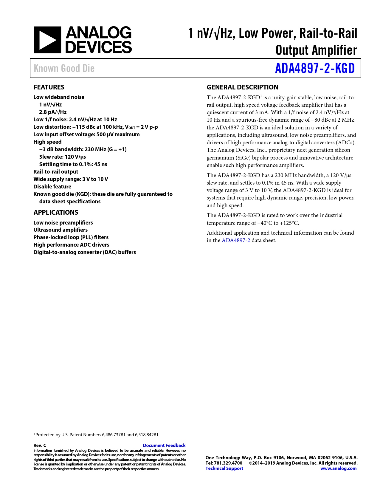 The ADA4897-2-KGD1 is a unity-gain stable, low noise, rail-to-