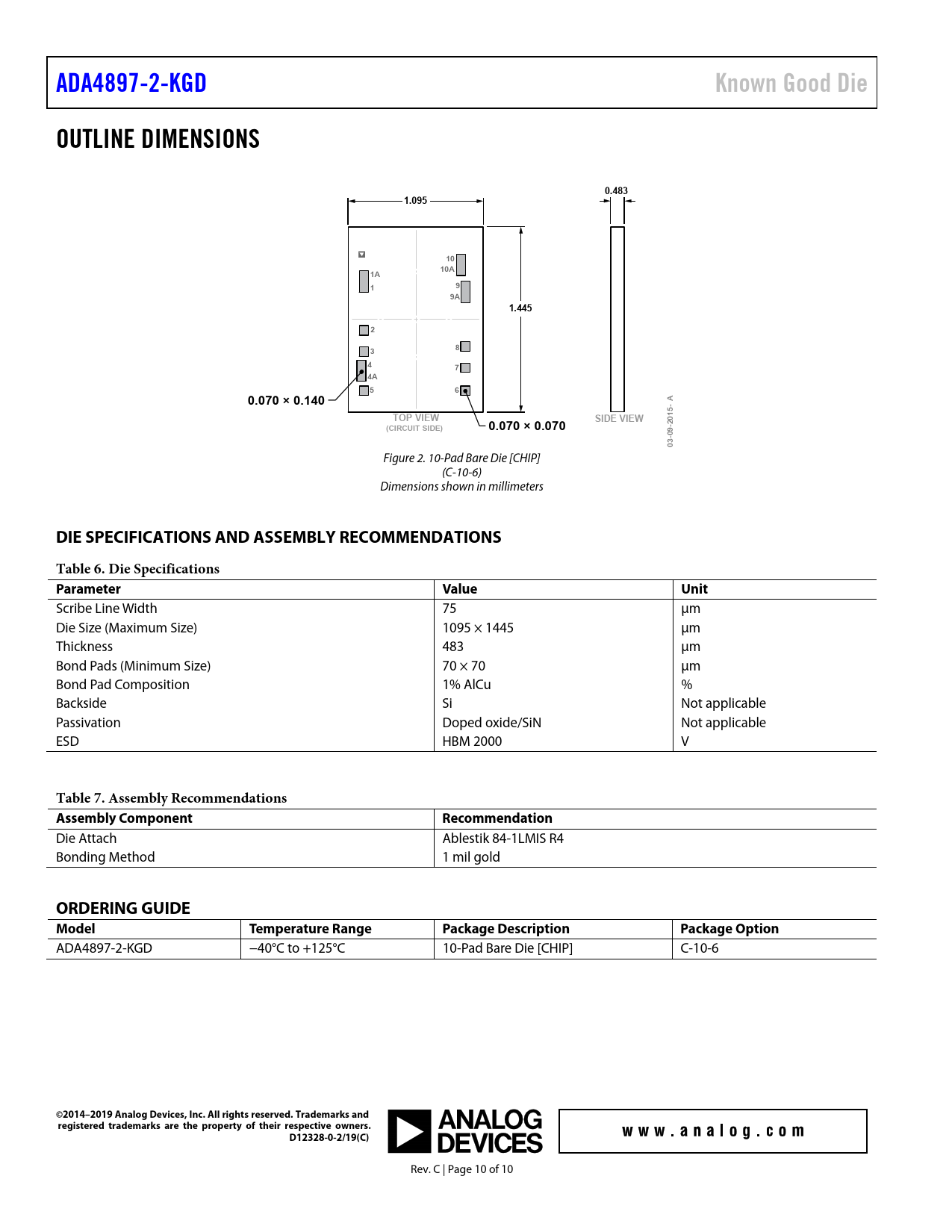 ADA4897-2-KGD. Known Good Die. OUTLINE DIMENSIONS. 0.483. 1.095. 10A. 1.445. 0.070 × 0.140. TOP VIEW. SIDE VIEW. 2015-. (CIRCUIT SIDE)