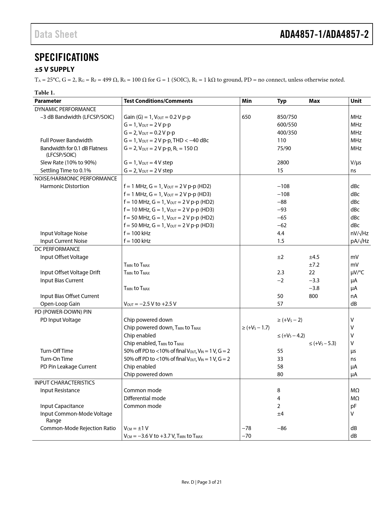 Data Sheet ADA4857-1/ADA4857-2 SPECIFICATIONS ±5 V SUPPLY Table 1 Parameter Test Conditions/Comments Min Typ Max Unit