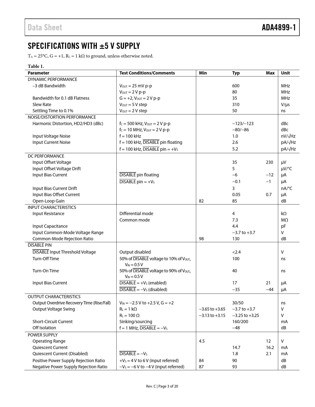 Data Sheet. ADA4899-1. SPECIFICATIONS WITH ±5 V SUPPLY. Table 1. Parameter. Test Conditions/Comments. Min. Typ. Max. Unit