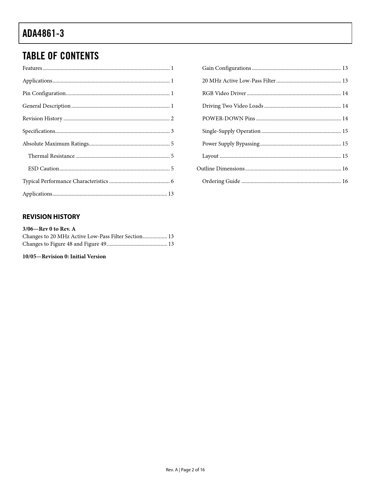 Seiten / Seite16 / 2 — ADA4861-3. TABLE OF CONTENTS. REVISION HISTORY. 3/06—Rev 0 to Rev. A. …