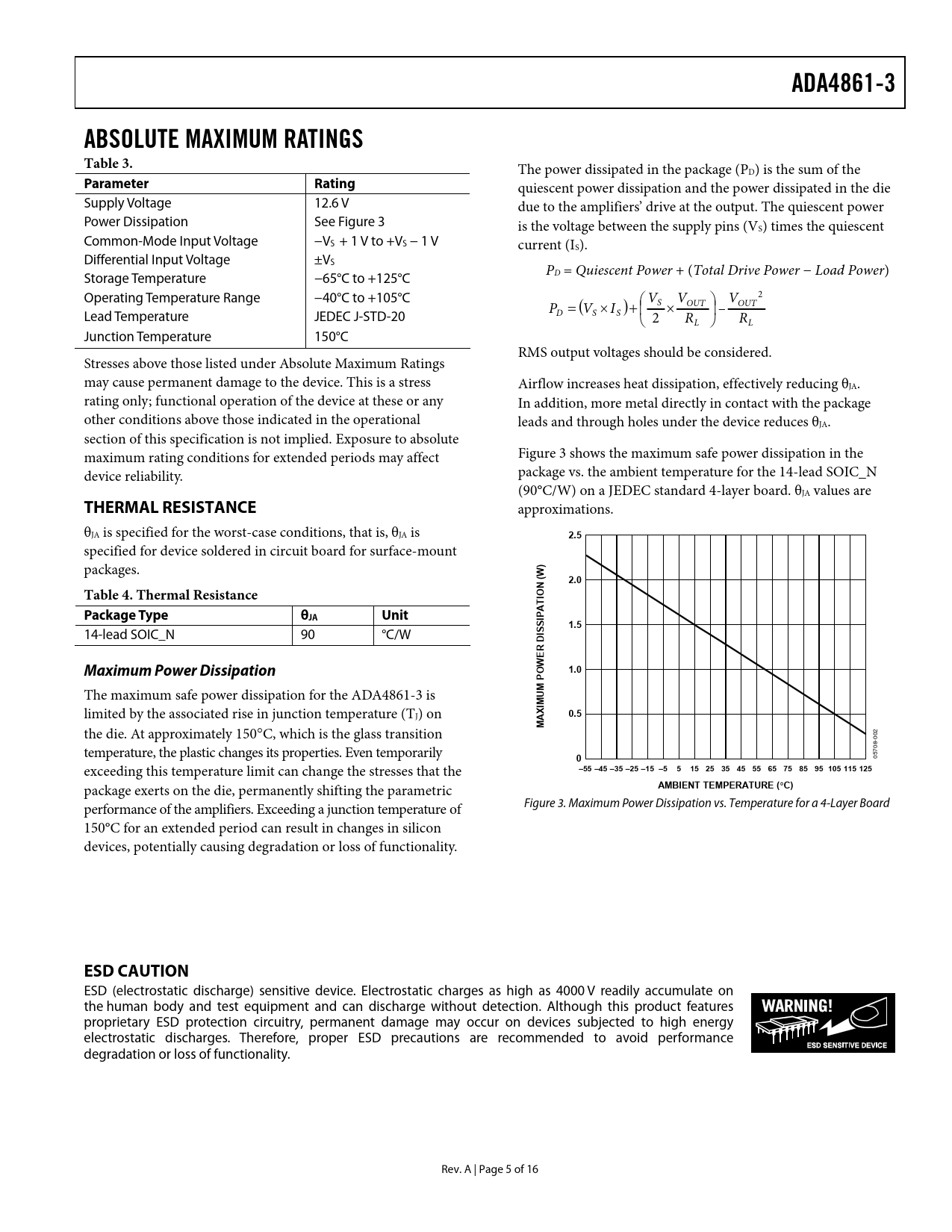 link to page 5 link to page 5 ADA4861-3ABSOLUTE MAXIMUM RATINGS Table 3. The power dissipated in the package (PD) is the sum of the Parameter Rating quiescent power dissipation and the power dissipated in the die Supply Voltage 12.6 V due to the amplifiers’ drive at the output. The quiescent power Power Dissipation See Figure 3 is the voltage between the supply pins (VS) times the quiescent Common-Mode Input Voltage −VS + 1 V to +VS − 1 V current (IS). Differential Input Voltage ±VS PD = Quiescent Power + (Total Drive Power − Load Power) Storage Temperature −65°C to +125°C Operating Temperature Range −40°C to +105°C ⎛ V V ⎞ V 2 = × + ⎜ × ⎟ D P ( S V IS ) S OUT OUT – Lead Temperature JEDEC J-STD-20 ⎝ 2 RL ⎠ RL Junction Temperature 150°C RMS output voltages should be considered. Stresses above those listed under Absolute Maximum Ratings may cause permanent damage to the device. This is a stress Airflow increases heat dissipation, effectively reducing θJA. rating only; functional operation of the device at these or any In addition, more metal directly in contact with the package other conditions above those indicated in the operational leads and through holes under the device reduces θJA. section of this specification is not implied. Exposure to absolute maximum rating conditions for extended periods may affect Figure 3 shows the maximum safe power dissipation in the device reliability. package vs. the ambient temperature for the 14-lead SOIC_N (90°C/W) on a JEDEC standard 4-layer board. θJA values are THERMAL RESISTANCE approximations. θJA is specified for the worst-case conditions, that is, θJA is 2.5 specified for device soldered in circuit board for surface-mount packages. ) W2.0N (Table 4. Thermal ResistanceIO ATPackage TypeθJA UnitIP S S1.5 14-lead SOIC_N 90 °C/W R DIE W O1.0Maximum Power DissipationP UM The maximum safe power dissipation for the ADA4861-3 is IM limited by the associated rise in junction temperature (TJ) on AX0.5M 2 the die. At approximately 150°C, which is the glass transition 00 8- 70 temperature, the plastic changes its properties. Even temporarily 0 05 –55 –45 –35 –25 –15 –5515 25 35 45 55 65 75 85 95 105 115 125 exceeding this temperature limit can change the stresses that the AMBIENT TEMPERATURE ( ° C) package exerts on the die, permanently shifting the parametric performance of the amplifiers. Exceeding a junction temperature of Figure 3. Maximum Power Dissipation vs. Temperature for a 4-Layer Board 150°C for an extended period can result in changes in silicon devices, potentially causing degradation or loss of functionality. ESD CAUTION ESD (electrostatic discharge) sensitive device. Electrostatic charges as high as 4000 V readily accumulate on the human body and test equipment and can discharge without detection. Although this product features proprietary ESD protection circuitry, permanent damage may occur on devices subjected to high energy electrostatic discharges. Therefore, proper ESD precautions are recommended to avoid performance degradation or loss of functionality. Rev. A | Page 5 of 16 Document Outline FEATURES APPLICATIONS PIN CONFIGURATION GENERAL DESCRIPTION TABLE OF CONTENTS REVISION HISTORY SPECIFICATIONS ABSOLUTE MAXIMUM RATINGS THERMAL RESISTANCE Maximum Power Dissipation ESD CAUTION TYPICAL PERFORMANCE CHARACTERISTICS APPLICATIONS GAIN CONFIGURATIONS 20 MHz ACTIVE LOW-PASS FILTER RGB VIDEO DRIVER DRIVING TWO VIDEO LOADS POWER-DOWN PINS SINGLE-SUPPLY OPERATION POWER SUPPLY BYPASSING LAYOUT OUTLINE DIMENSIONS ORDERING GUIDE