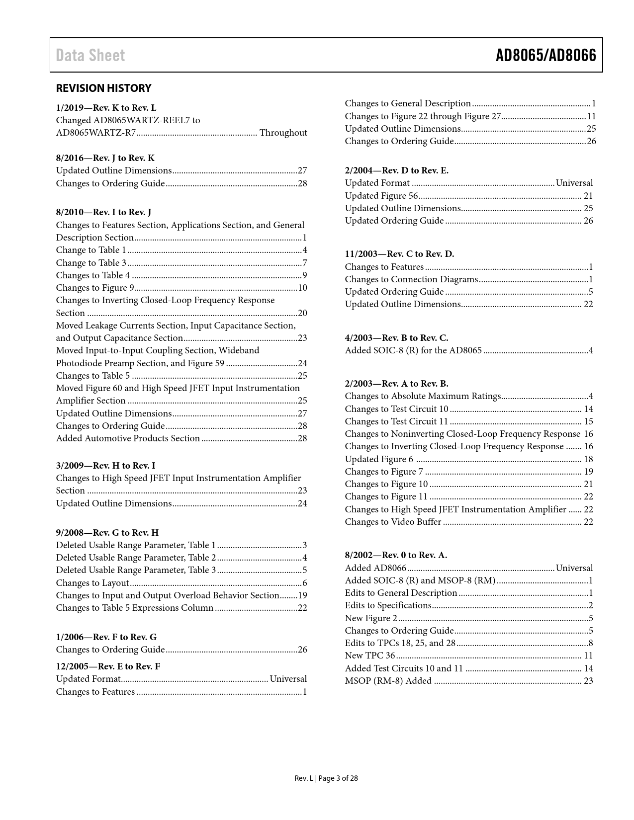 Seiten / Seite28 / 3 — Data Sheet. AD8065/AD8066. REVISION HISTORY. 1/2019—Rev. K to Rev. L. …