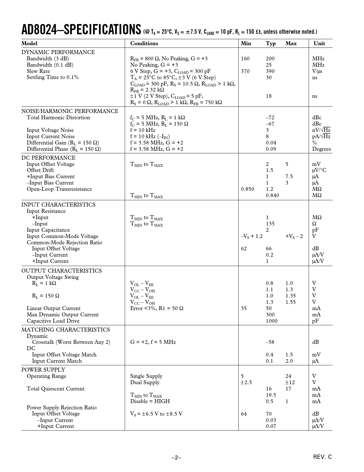 AD8024–SPECIFICATIONS (@ TA = 25. C, VS =. 7.5 V, CLOAD = 10 pF, RL = 150. , unless otherwise noted.) Model. Conditions. Min. Typ