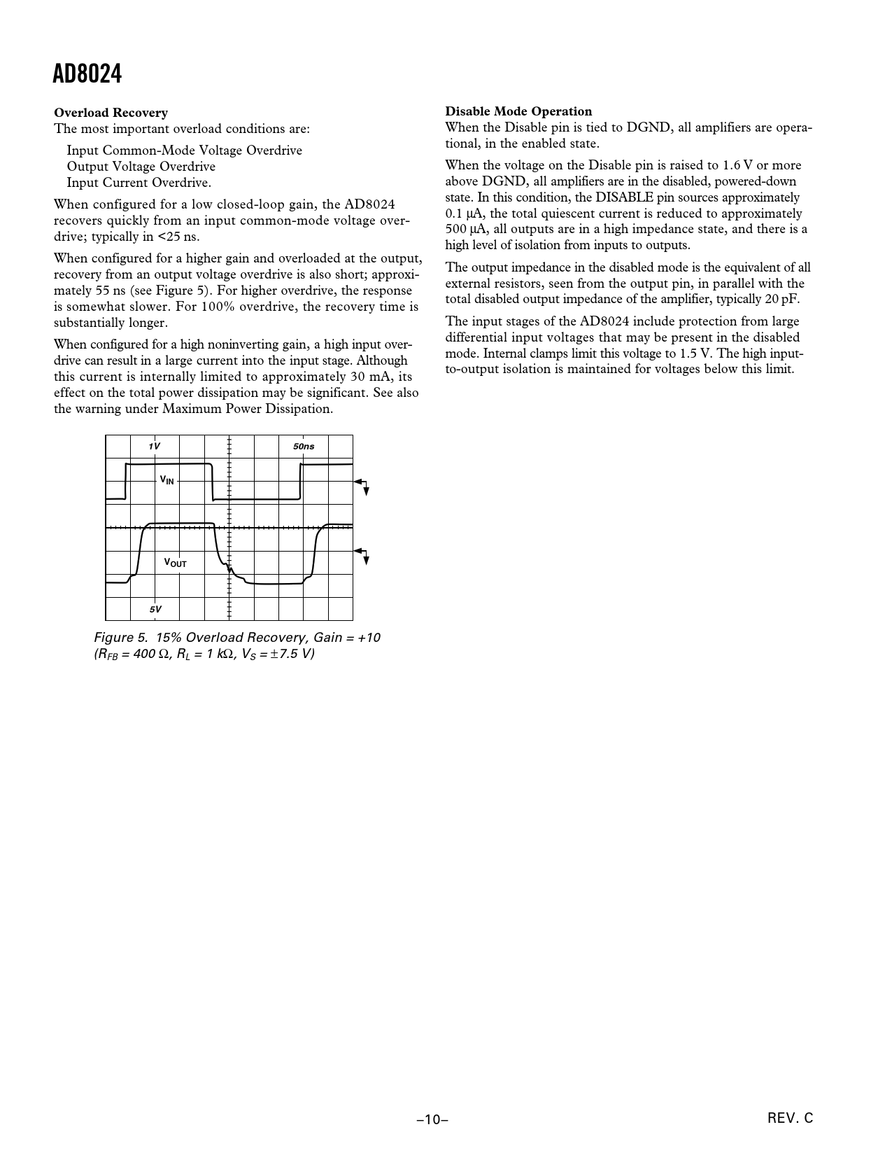 The most important overload conditions are: When the Disable pin is tied to DGND, all amplifiers are opera- tional, in the enabled state. Input Common-Mode Voltage Overdrive Output Voltage Overdrive When the voltage on the Disable pin is raised to 1.6 V or more Input Current Overdrive. above DGND, all amplifiers are in the disabled, powered-down state. In this condition, the DISABLE pin sources approximately When configured for a low closed-loop gain, the AD8024 0.1 µA, the total quiescent current is reduced to approximately recovers quickly from an input common-mode voltage over- 500 µA, all outputs are in a high impedance state, and there is a drive; typically in <25 ns. high level of isolation from inputs to outputs. When configured for a higher gain and overloaded at the output, The output impedance in the disabled mode is the equivalent of all recovery from an output voltage overdrive is also short; approxi- external resistors, seen from the output pin, in parallel with the mately 55 ns (see Figure 5). For higher overdrive, the response total disabled output impedance of the amplifier, typically 20 pF. is somewhat slower. For 100% overdrive, the recovery time is substantially longer. The input stages of the AD8024 include protection from large differential input voltages that may be present in the disabled When configured for a high noninverting gain, a high input over- mode. Internal clamps limit this voltage to 1.5 V. The high input- drive can result in a large current into the input stage. Although to-output isolation is maintained for voltages below this limit. this current is internally limited to approximately 30 mA, its effect on the total power dissipation may be significant. See also the warning under Maximum Power Dissipation.