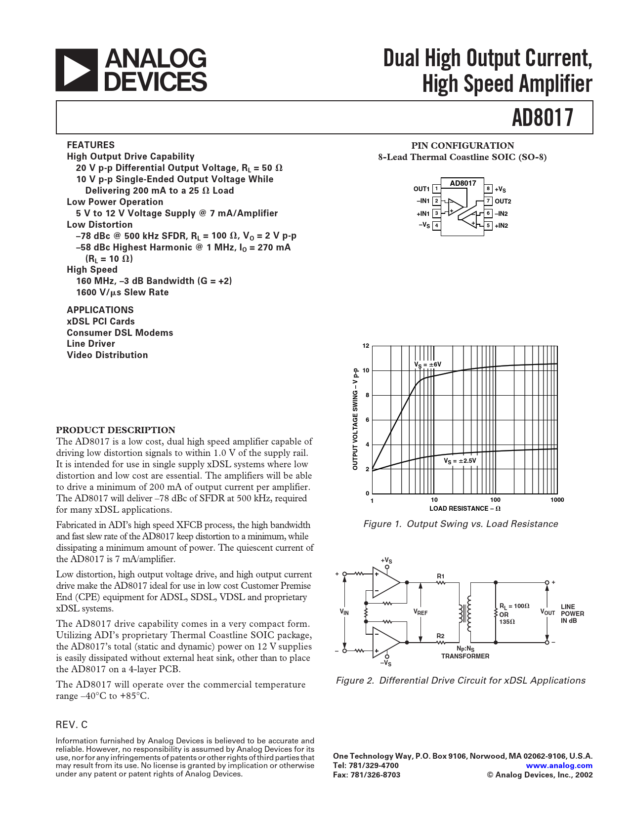 the AD8017 on a 4-layer PCB. The AD8017 will operate over the commercial temperature Figure 2. Differential Drive Circuit for xDSL Applications range –40°C to +85°C. REV. C Information furnished by Analog Devices is believed to be accurate and reliable. However, no responsibility is assumed by Analog Devices for its use, nor for any infringements of patents or other rights of third parties that