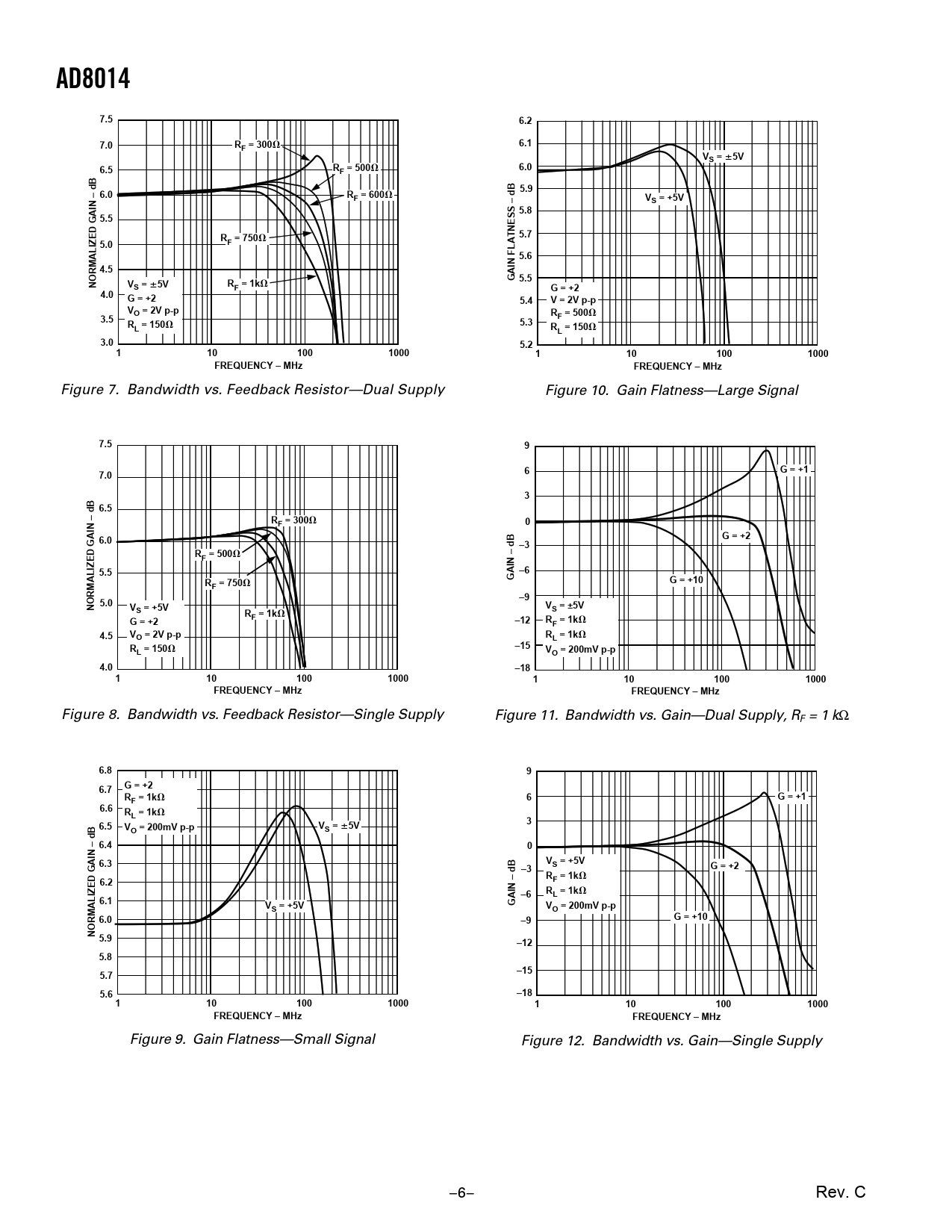 AD8014. 7.5. 6.2. 7.0. RF = 300. 6.1. VS =. 6.5. RF = 500. 6.0. 5.9. F = 600. VS = +5V. 5.8. 5.5. 5.7. F = 750. 5.0. 5.6. 4.5. GAIN FLATNESS – dB 5.5