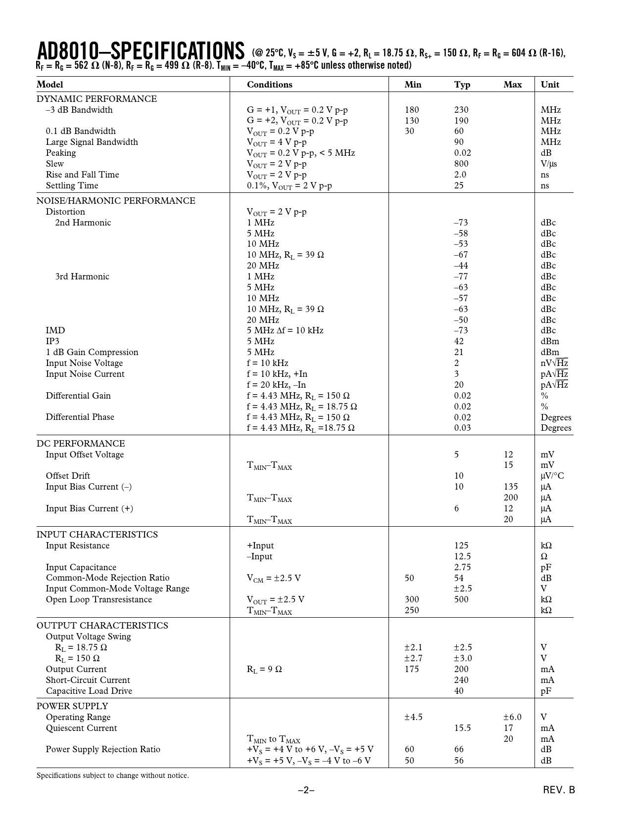 AD8010–SPECIFICATIONS (@ 25 C, VS = 5 V, G = +2, RL = 18.75 , RS+ = 150 , RF = RG = 604 (R-16), RF = RG = 562 (N-8), RF = RG = 499 (R-8). TMIN = –40 C, TMAX = +85 C unless otherwise noted) Model Conditions Min Typ Max Unit
