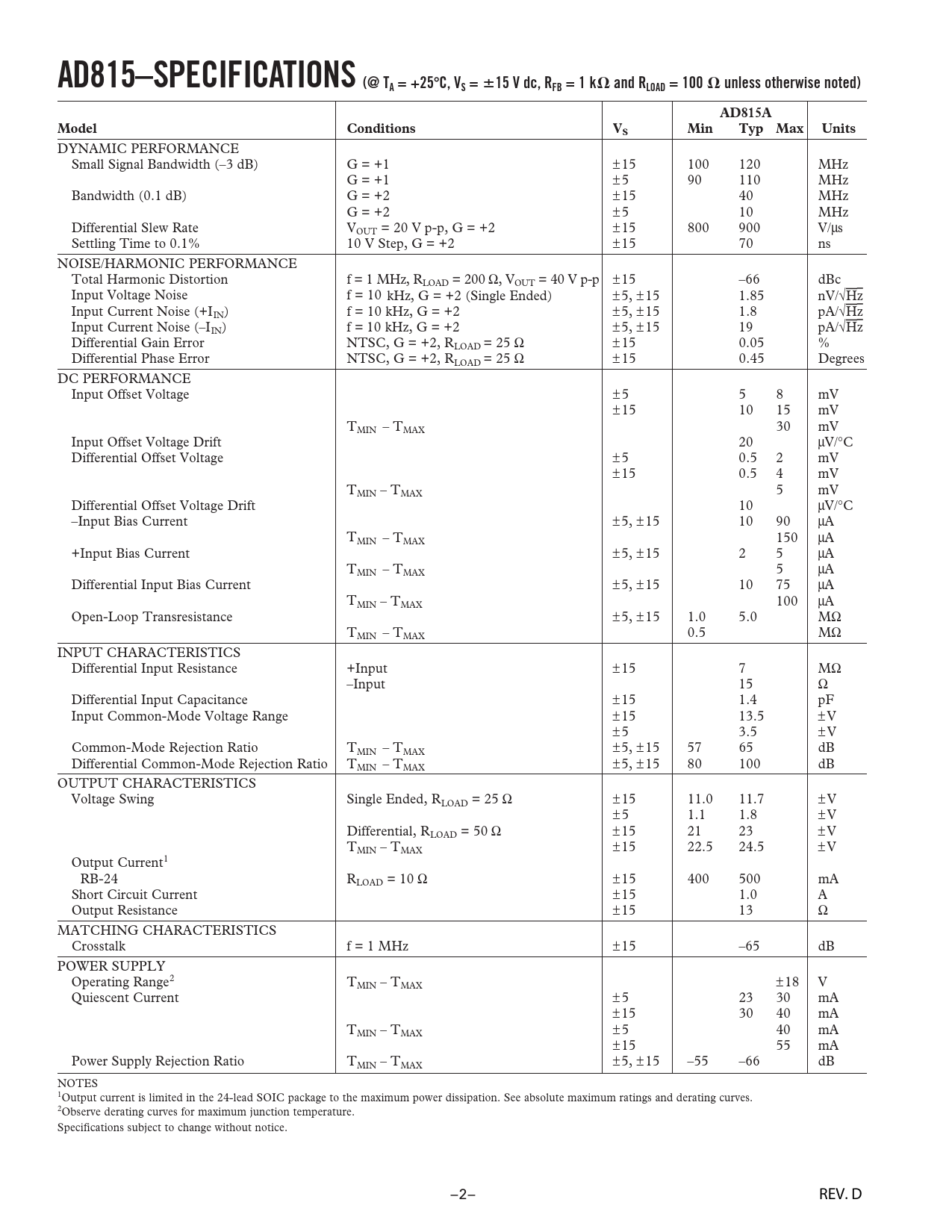 AD815–SPECIFICATIONS (@ TA = +25 C, VS = 15 V dc, RFB = 1 k and RLOAD = 100 unless otherwise noted) AD815A Model Conditions Min