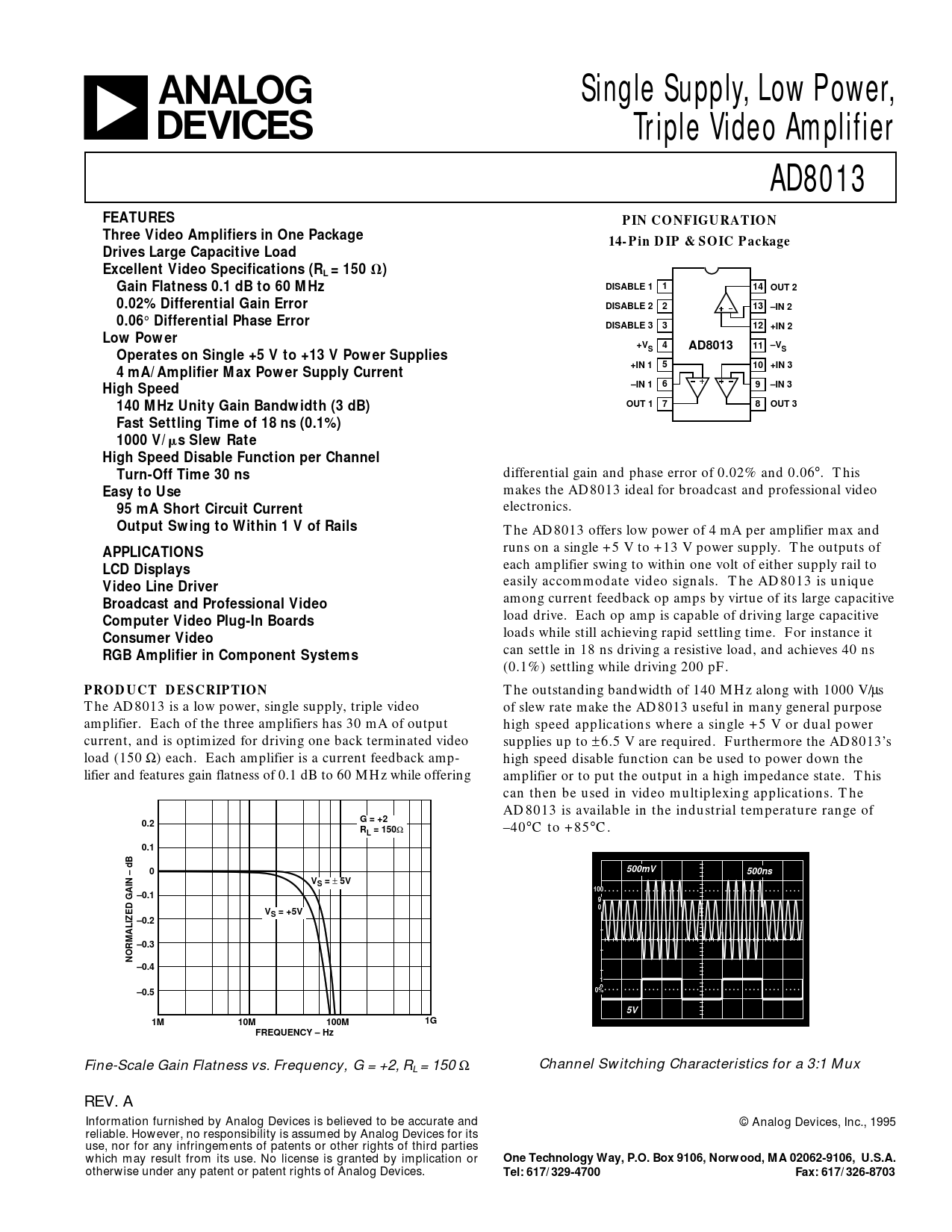 Fine-Scale Gain Flatness vs. Frequency, G = +2, R Channel Switching Characteristics for a 3:1 Mux L = 150 Ω REV. A Information furnished by Analog Devices is believed to be accurate and © Analog Devices, Inc., 1995 reliable. However, no responsibility is assumed by Analog Devices for its use, nor for any infringements of patents or other rights of third parties which may result from its use. No license is granted by implication or