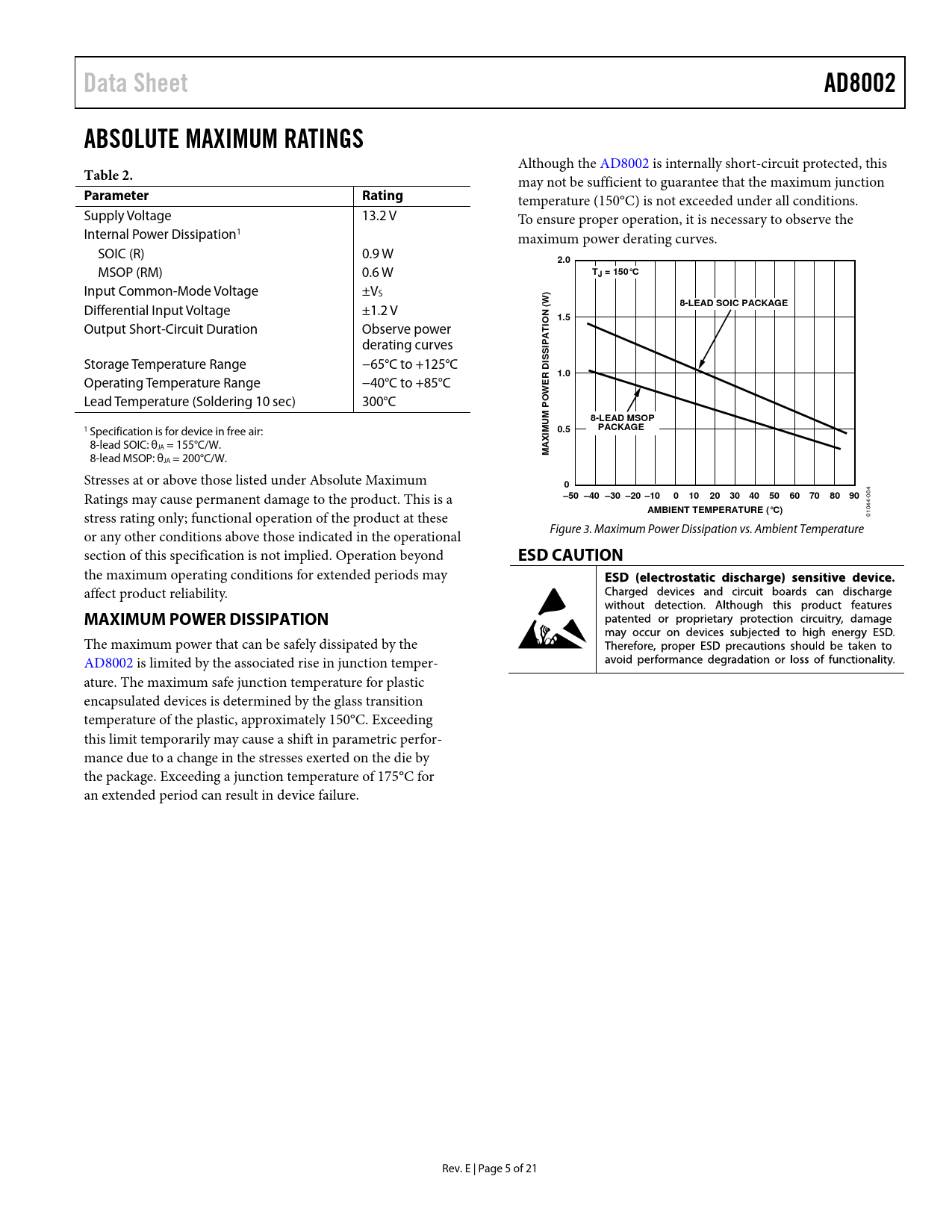 Data Sheet. AD8002. ABSOLUTE MAXIMUM RATINGS. Table 2. Parameter. Rating. 2.0. TJ = 150°C. 8-LEAD SOIC PACKAGE. 1.5. IO T. ISSI D. 1.0. ER W. M PO
