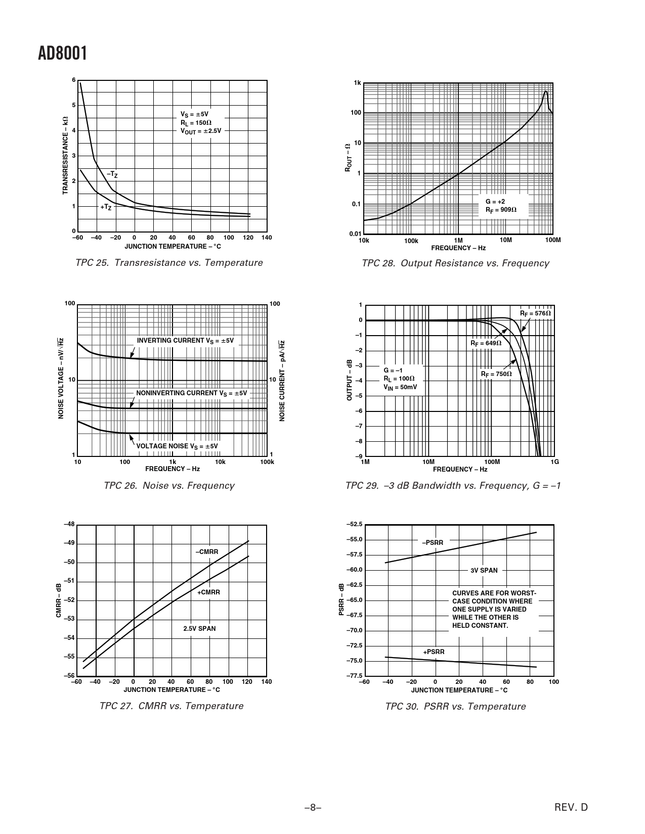 AD8001 6 1k 5 V 100 S = 5V RL = 150 – k 4 VOUT = 2.5V 10 3 OUTR –T 1 Z 2 TRANSRESISTANCE G = +2 1 +T 0.1 Z RF = 909 0 0.01 –60 –40 –20 0 20 40 60 80 100 120 140 10k 100k 1M 10M 100M JUNCTION TEMPERATURE – C FREQUENCY – Hz