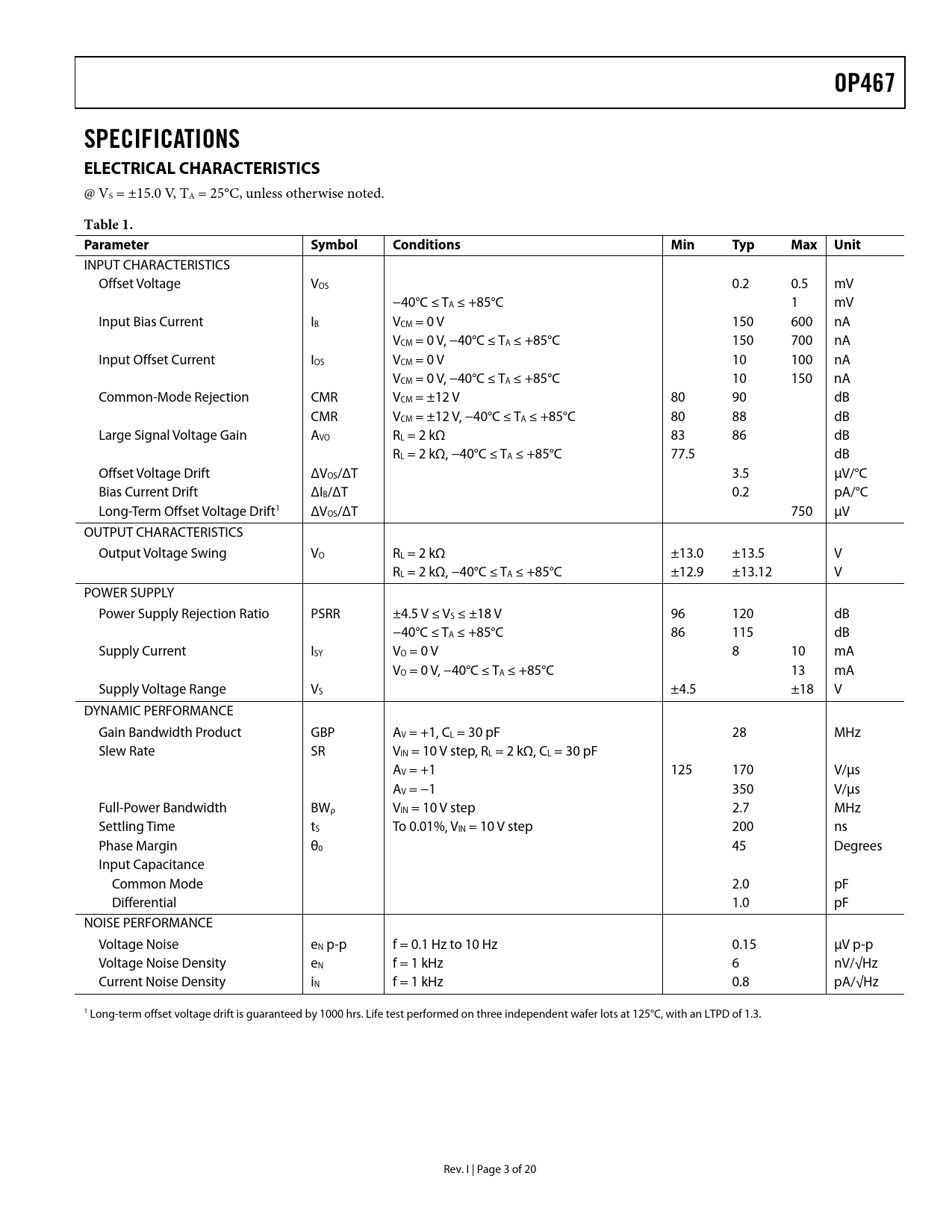 link to page 20 link to page 20 link to page 3 link to page 3 OP467SPECIFICATIONS ELECTRICAL CHARACTERISTICS @ VS = ±15.0 V, TA = 25°C, unless otherwise noted. Table 1. ParameterSymbolConditionsMinTypMaxUnit INPUT CHARACTERISTICS Offset Voltage VOS 0.2 0.5 mV −40°C ≤ TA ≤ +85°C 1 mV Input Bias Current IB VCM = 0 V 150 600 nA VCM = 0 V, −40°C ≤ TA ≤ +85°C 150 700 nA Input Offset Current IOS VCM = 0 V 10 100 nA VCM = 0 V, −40°C ≤ TA ≤ +85°C 10 150 nA Common-Mode Rejection CMR VCM = ±12 V 80 90 dB CMR VCM = ±12 V, −40°C ≤ TA ≤ +85°C 80 88 dB Large Signal Voltage Gain AVO RL = 2 kΩ 83 86 dB RL = 2 kΩ, −40°C ≤ TA ≤ +85°C 77.5 dB Offset Voltage Drift ΔVOS/ΔT 3.5 μV/°C Bias Current Drift ΔIB/ΔT 0.2 pA/°C Long-Term Offset Voltage Drift1 ΔVOS/ΔT 750 μV OUTPUT CHARACTERISTICS Output Voltage Swing VO RL = 2 kΩ ±13.0 ±13.5 V RL = 2 kΩ, −40°C ≤ TA ≤ +85°C ±12.9 ±13.12 V POWER SUPPLY Power Supply Rejection Ratio PSRR ±4.5 V ≤ VS ≤ ±18 V 96 120 dB −40°C ≤ TA ≤ +85°C 86 115 dB Supply Current ISY VO = 0 V 8 10 mA VO = 0 V, −40°C ≤ TA ≤ +85°C 13 mA Supply Voltage Range VS ±4.5 ±18 V DYNAMIC PERFORMANCE Gain Bandwidth Product GBP AV = +1, CL = 30 pF 28 MHz Slew Rate SR VIN = 10 V step, RL = 2 kΩ, CL = 30 pF AV = +1 125 170 V/μs AV = −1 350 V/μs Full-Power Bandwidth BWρ VIN = 10 V step 2.7 MHz Settling Time tS To 0.01%, VIN = 10 V step 200 ns Phase Margin θ0 45 Degrees Input Capacitance Common Mode 2.0 pF Differential 1.0 pF NOISE PERFORMANCE Voltage Noise eN p-p f = 0.1 Hz to 10 Hz 0.15 μV p-p Voltage Noise Density eN f = 1 kHz 6 nV/√Hz Current Noise Density iN f = 1 kHz 0.8 pA/√Hz 1 Long-term offset voltage drift is guaranteed by 1000 hrs. Life test performed on three independent wafer lots at 125°C, with an LTPD of 1.3. Rev. I | Page 3 of 20 Document Outline FEATURES APPLICATIONS GENERAL DESCRIPTION PIN CONFIGURATIONS TABLE OF CONTENTS REVISION HISTORY SPECIFICATIONS ELECTRICAL CHARACTERISTICS WAFER TEST LIMITS ABSOLUTE MAXIMUM RATINGS THERMAL RESISTANCE DICE CHARACTERISTICS ESD CAUTION TYPICAL PERFORMANCE CHARACTERISTICS APPLICATIONS INFORMATION OUTPUT SHORT-CIRCUIT PERFORMANCE UNUSED AMPLIFIERS PCB LAYOUT CONSIDERATIONS GROUNDING POWER SUPPLY CONSIDERATIONS SIGNAL CONSIDERATIONS PHASE REVERSAL SATURATION RECOVERY TIME HIGH SPEED INSTRUMENTATION AMPLIFIER 2 MHz BIQUAD BAND-PASS FILTER FAST I-TO-V CONVERTER OP467 SPICE MARCO-MODEL OUTLINE DIMENSIONS ORDERING GUIDE